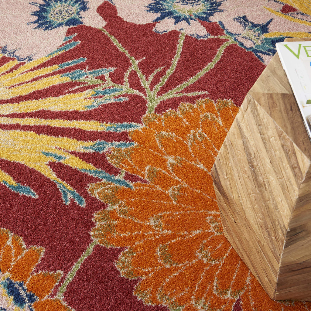 Details: Fill your space with the warmth and comfort of the Allur Collection. With its eclectic mix of contemporary florals, Persian-inspired medallions, and tribal patterns in bright jewel tones, each Allur area rug exudes boho appeal. These vibrant rugs are Ideal for use in your living room, bedroom, or home office. Machine made of low shed, low profile polypropylene for easy cleaning. Invite a light and airy vibe to your surroundings with this Allur Collection area rug. In this botanical scene, vibrant orange, yellow, ivory, and turquoise blue floral motifs are woven onto a brick red ground for a lush complement to contemporary settings. This colorful area rug is machine made of easy-clean polypropylene fibers for worry free upkeep.