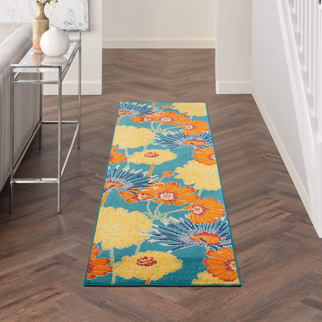 Details: Fill your space with the warmth and comfort of the Allur Collection. With its eclectic mix of contemporary florals, Persian-inspired medallions, and tribal patterns in bright jewel tones, each Allur area rug exudes boho appeal. These vibrant rugs are Ideal for use in your living room, bedroom, or home office. Machine made of low shed, low profile polypropylene for easy cleaning. Invite a light and airy vibe to your surroundings with this Allur Collection area rug. In this botanical scene, vibrant orange, yellow, and navy-blue floral motifs are woven onto a turquoise blue ground for a lush complement to contemporary settings. This colorful area rug is machine made of easy-clean polypropylene fibers for worry free upkeep.