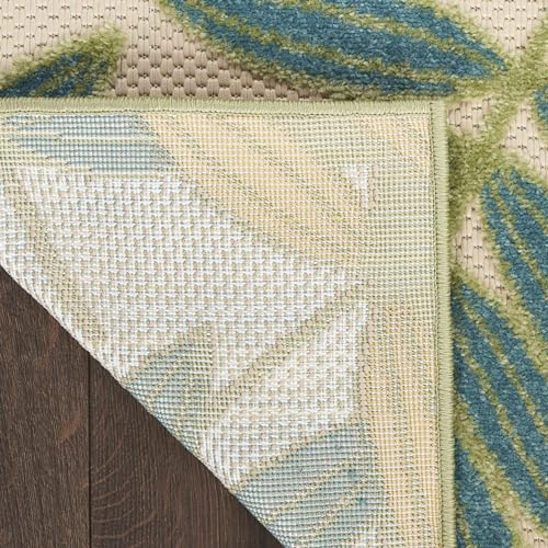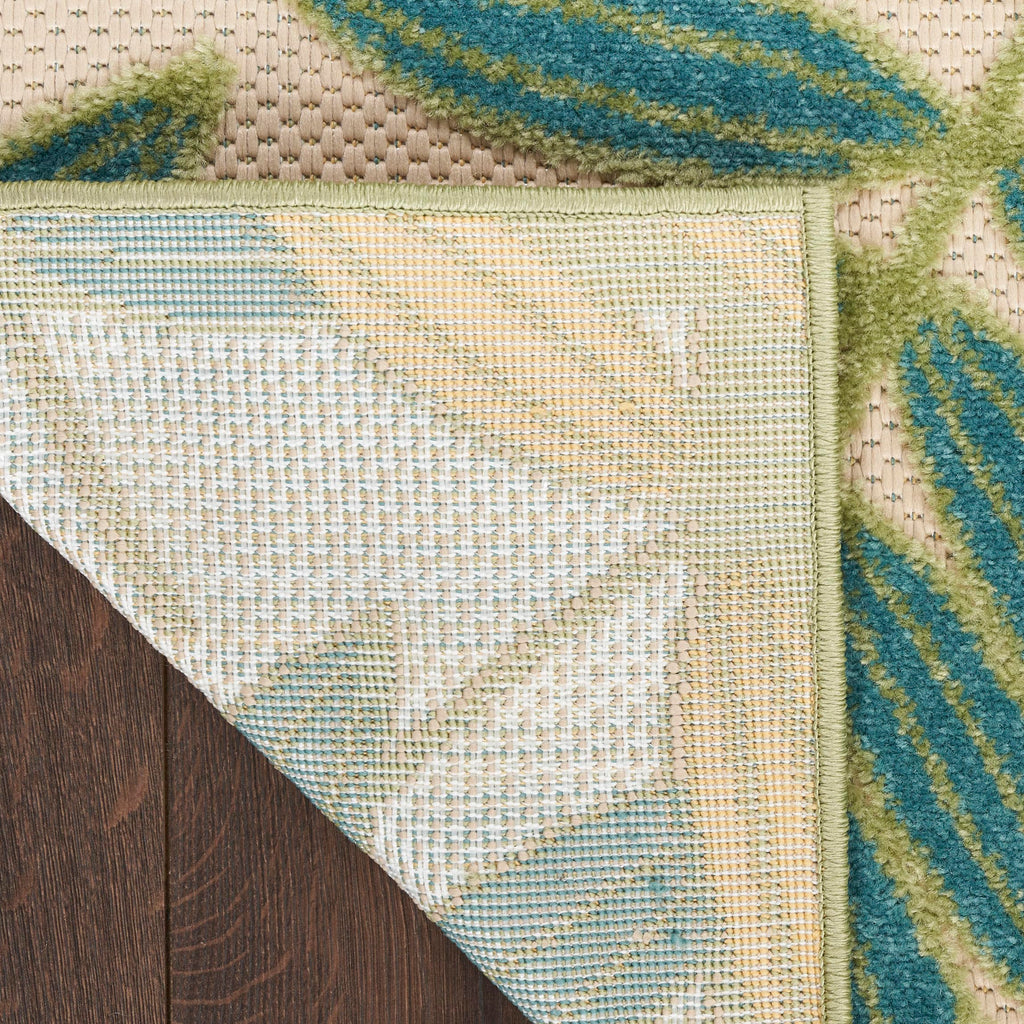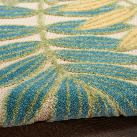 Details: This sunny and sensational collection of flat-woven indoor/outdoor rugs is pretty, practical, and perfect for high-traffic areas. With its inviting assortment of classic and contemporary designs, tempting color palettes, and terrific textures, these multipurpose rugs will afford an air of simple sophistication to any environment. The cheerful and charming oversized leaf design of this Aloha outdoor rug is a fun way to bring tropical style to your patio, balcony, porch, deck, or yard. The high-low weave, presented in shades of yellow, green, and blue, adds soft texture and a pop of dimension designed to spark conversation. Created from premium stain-resistant fibers for long wear and low maintenance: simply hose rinse and air dry. To extend the life of your rug, bring indoors during extreme weather.