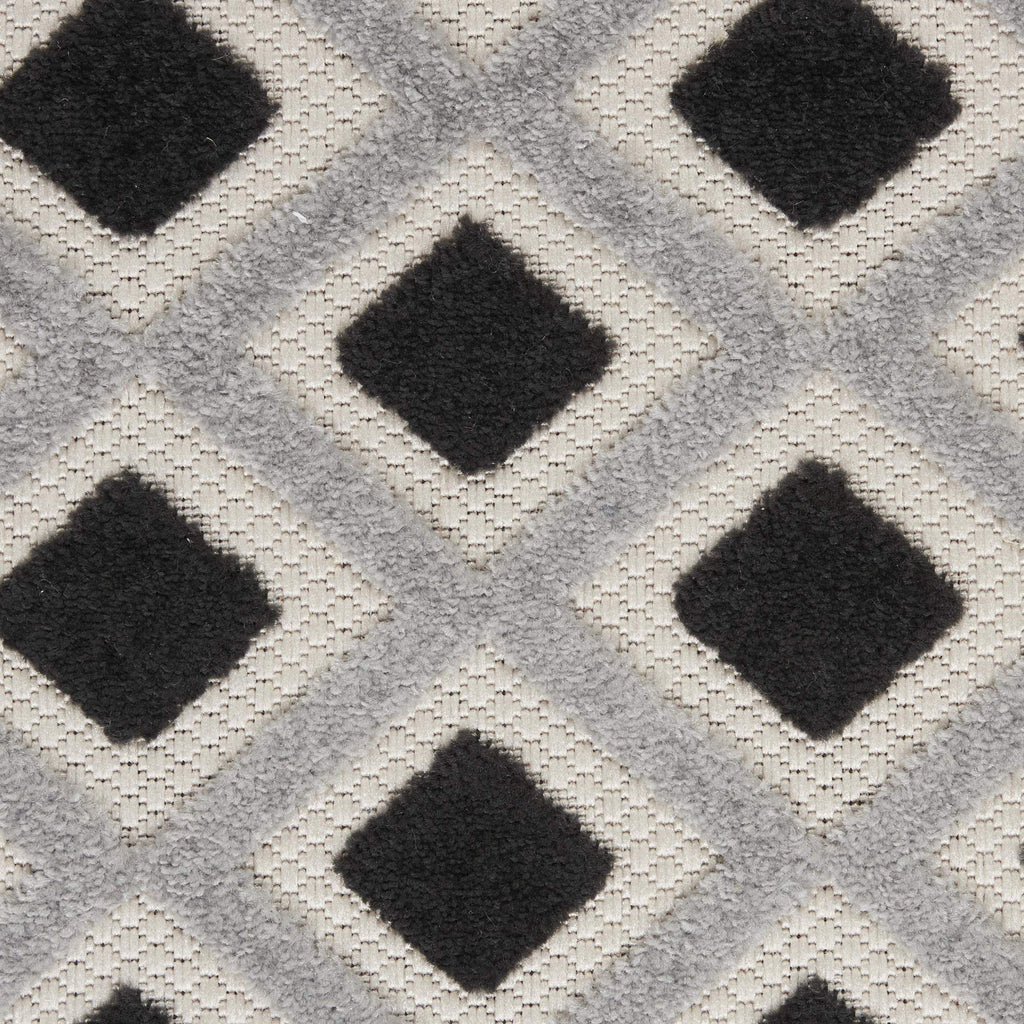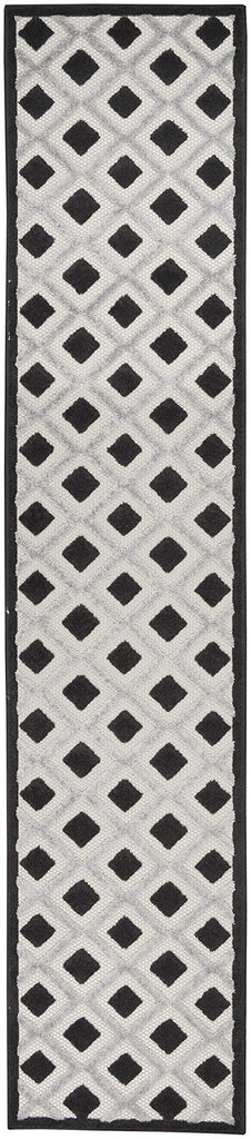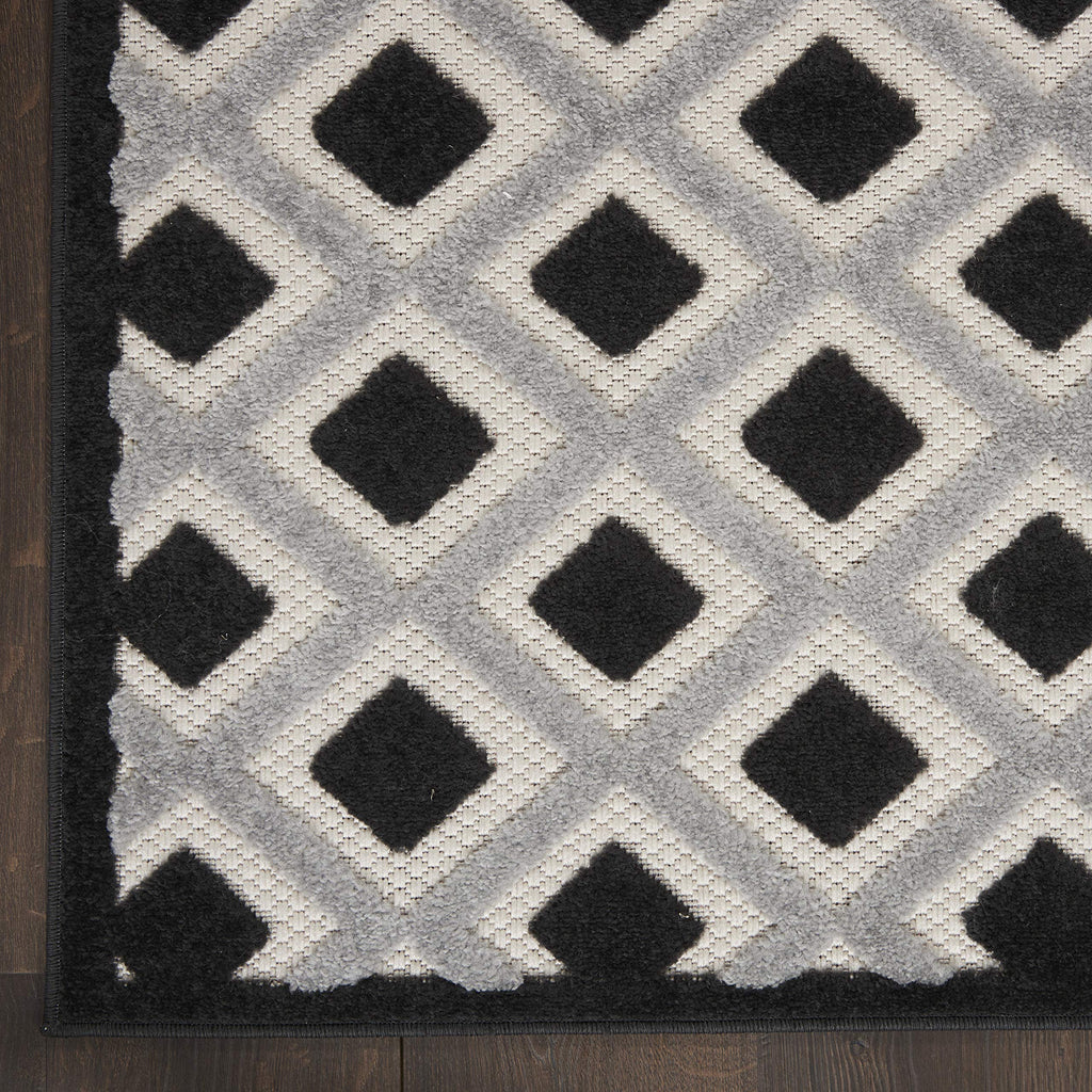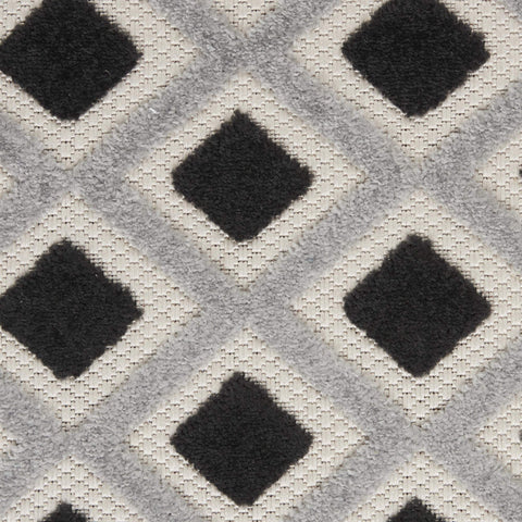 Details: This sunny and sensational collection of flat-woven indoor/outdoor rugs is pretty, practical, and perfect for high-traffic areas. With its inviting assortment of classic and contemporary designs, tempting color palettes, and terrific textures, these multipurpose rugs will afford an air of simple sophistication to any environment. Introduce texture and pattern to your porch or deck with ease with this indoor/outdoor rug from the Aloha Collection. Simple in its sophistication, it features an all-over concentric diamond motif with a simple border in black, white, and grey tones that work beautifully in modern and contemporary settings. Premium, stain resistant fibers offer durability and ease of cleaning – just rinse with a hose and air dry!