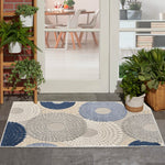 Details: This sunny and sensational collection of flat-woven indoor/outdoor rugs is pretty, practical, and perfect for high-traffic areas. With its inviting assortment of classic and contemporary designs, tempting color palettes, and terrific textures, these multipurpose rugs will afford an air of simple sophistication to any environment. Liven up your space with the bold geometric design of this outdoor rug from the Aloha Collection. Presented in grey, ivory, and blue, the overlapping circular tear drop pattern is enhanced by a soft, raised texture that stands out against its flatwoven ground. With a versatile, easy to clean construction, this neutral rug beautifully complements your indoor and outdoor spaces including the living room, dining room, hallway, deck, and patio.