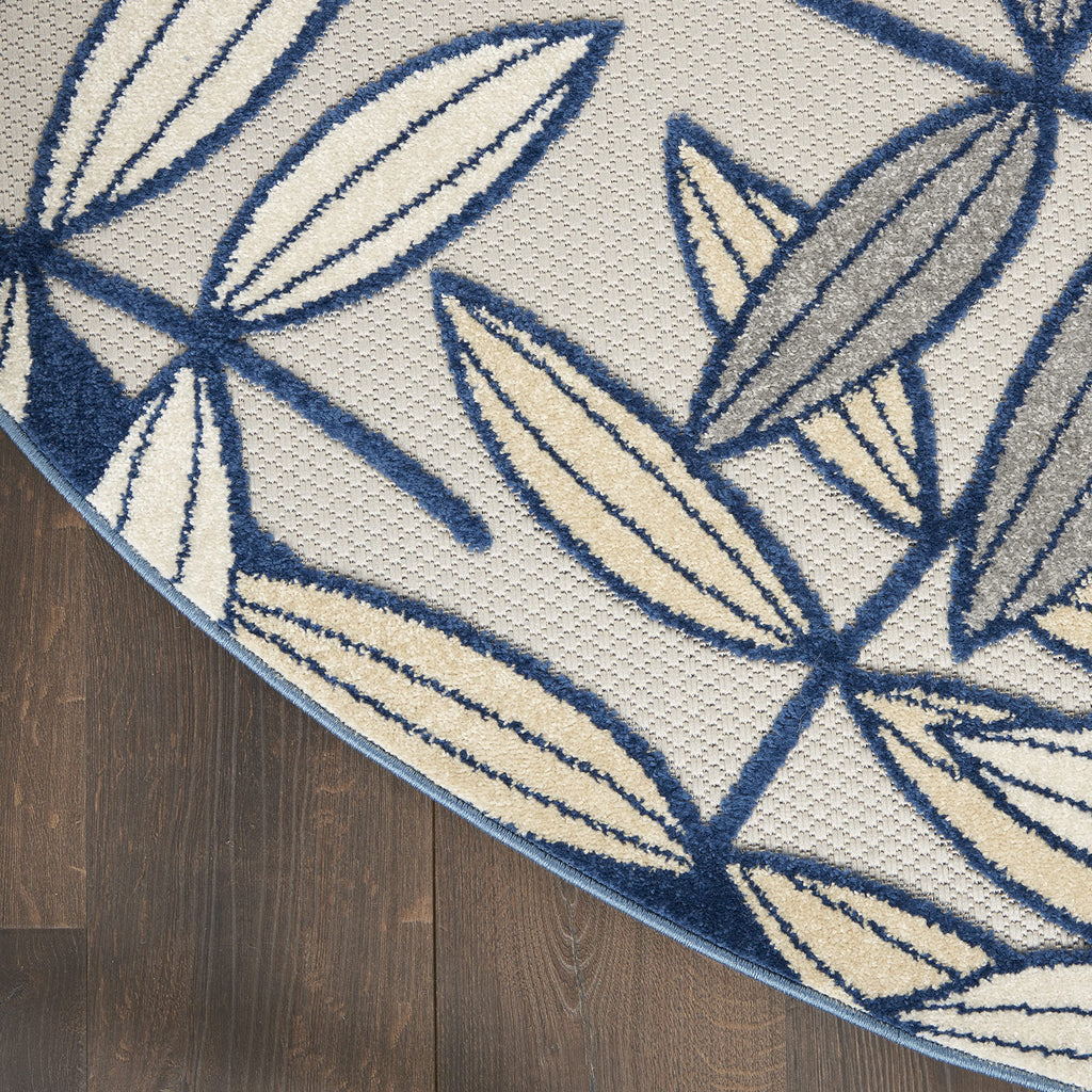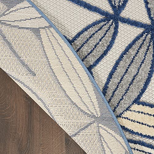 Details: This sunny and sensational collection of flat-woven outdoor rugs is pretty, practical, and perfect for high-traffic areas. With its inviting assortment of classic and contemporary designs, tempting color palettes, and terrific textures, these multipurpose rugs will afford an air of simple sophistication to any environment. A cheerful and charming oversized leaf design is a fun, flirty, and fashionable way to uplift any environment, especially when presented in complementary hues of grey, navy, and ivory. This Aloha outdoor area rug from Nourison is created from premium stain-resistant fibers for long wear, low maintenance, and a splendid texture.