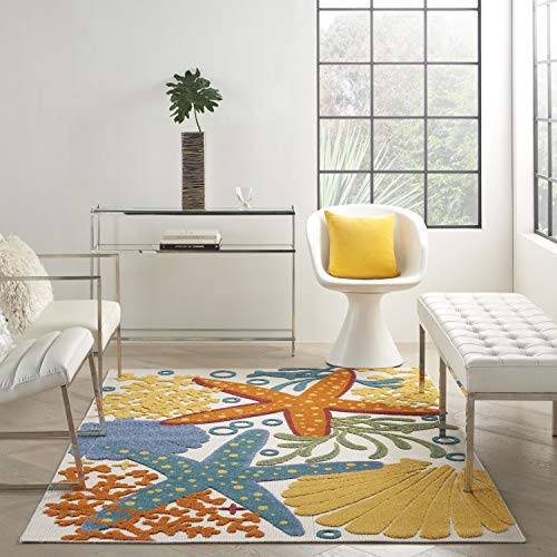 Details: This sunny and sensational collection of flat-woven indoor/outdoor rugs is pretty, practical, and perfect for high-traffic areas. With its inviting assortment of classic and contemporary designs, tempting color palettes, and terrific textures, these multipurpose rugs will afford an air of simple sophistication to any environment.Features Coastal themed indoor/outdoor area rug in yellow, green, red, orange, blue, and white multicolorMachine made of stain resistant polypropylene in a high-low, 0.25-inch pileEasy to clean: Just rinse with a hose and air dryDue to the detailed construction of our rugs, both handmade and machine-made, sizes may vary by up to three inches in width or length.Rug pad recommendedBrand: NourisonCollection: AlohaColor: MulticolorSize: 3'6" x 5'6"Shape: RectangleConstruction: Machine madeConstruction Technique: Power-loomedMaterial: 100% PolypropyleneShedding: Low sheddingNon-Slip Back: NoLatex Free: NoBacking: LatexBorder: Borderless designMade In Turkey