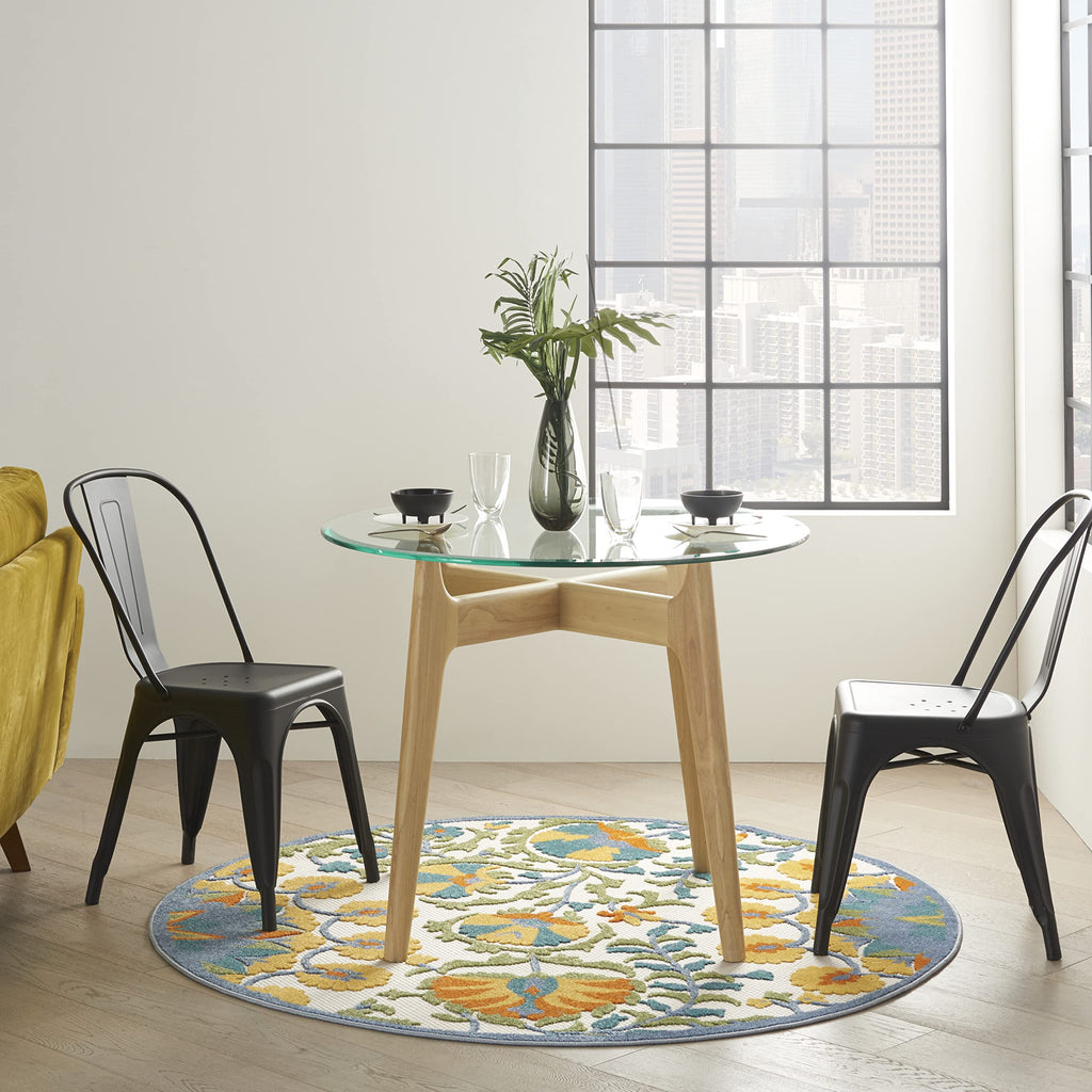 - Bold floral outdoor area rug in blue, yellow, orange, green, and white