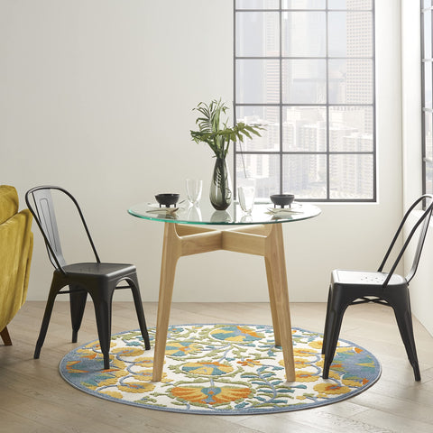 Details: This sunny and sensational collection of flat-woven indoor/outdoor rugs is pretty, practical, and perfect for high-traffic areas. With its inviting assortment of classic and contemporary designs, tempting color palettes, and terrific textures, these multipurpose rugs will afford an air of simple sophistication to any environment. Beautifully bold and texturally rich, this floral indoor/outdoor area rug from the Aloha Collection lends a warm and sunny vibe to your porch or patio. Its high-low styled weave is crafted in vivid shades of blue, yellow, orange, and green on a classic white ground. Premium stain resistant fibers offer durability and ease of cleaning – simply rinse with a hose and let it air dry!