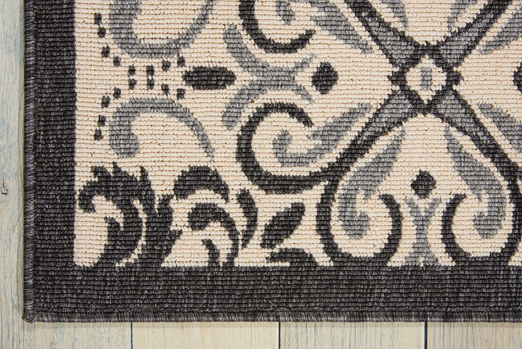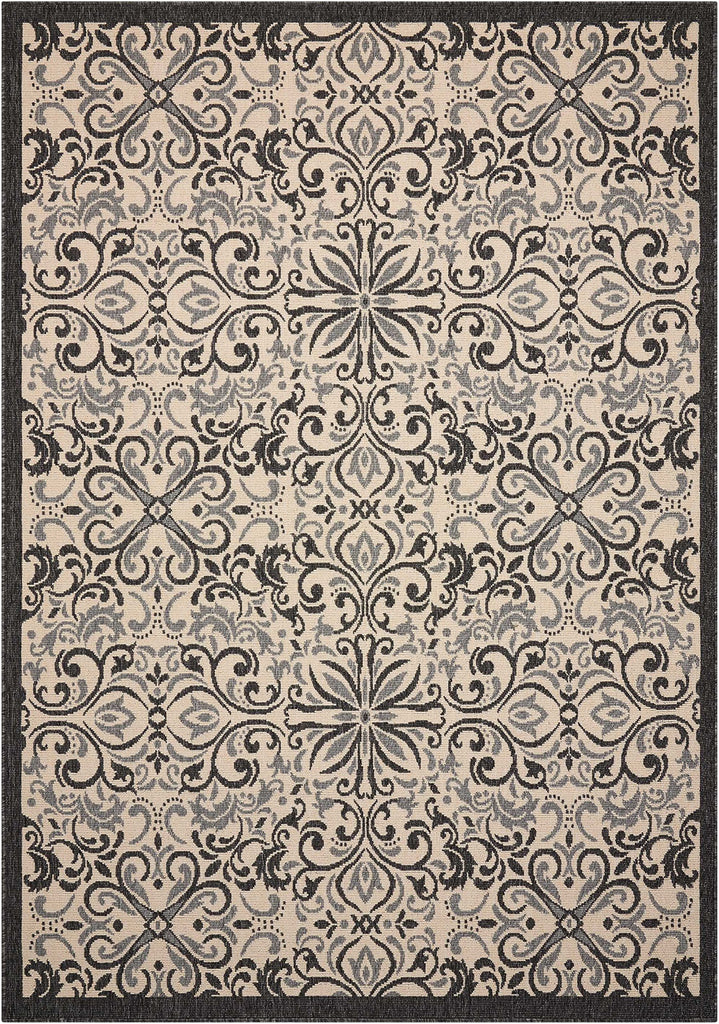Details: You can feel the light, lush touch of Island sands in this charming Caribbean Collection area rug. Soft sand is punctuated by an intricate pattern in dawn blue, grey and anthracite. A simple border defines the space of this pigment-dyed indoor-outdoor rug.