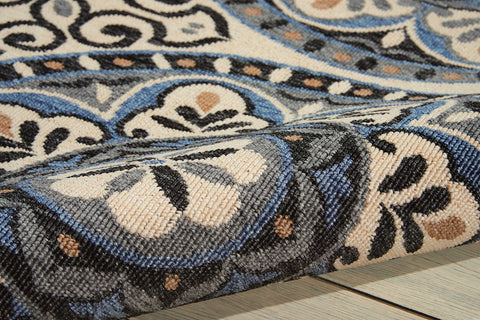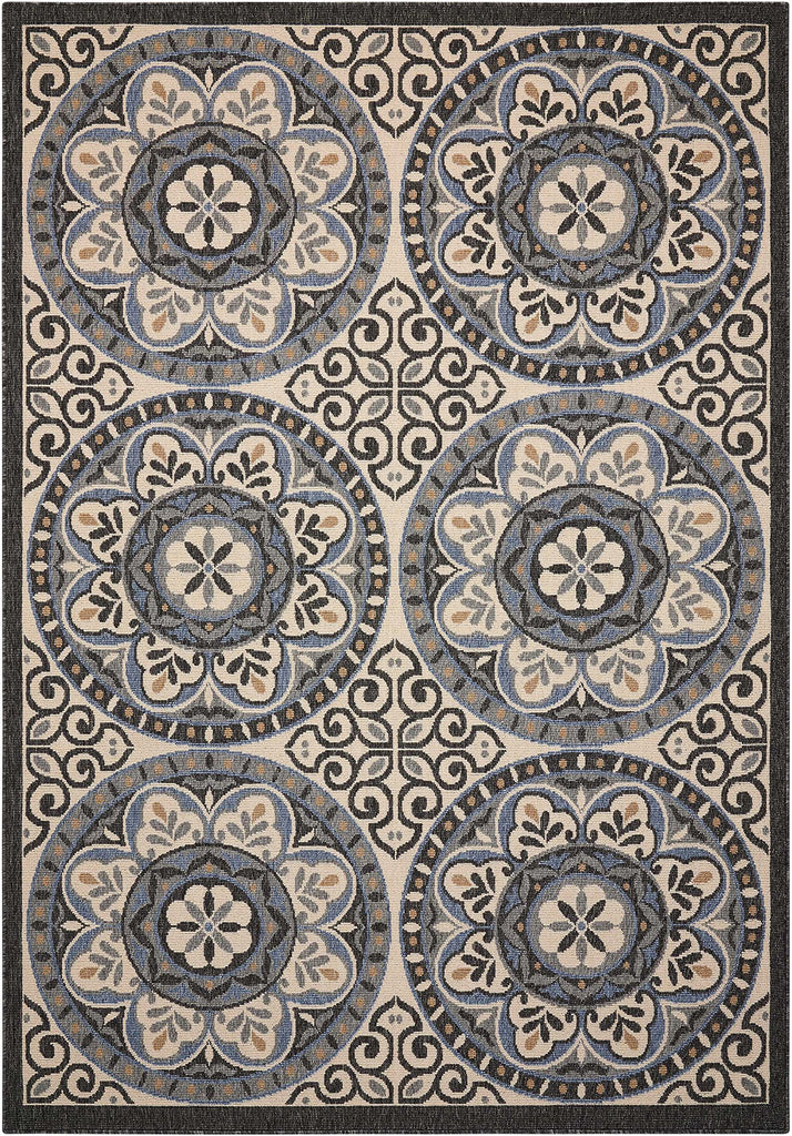 Details: Imagine a beautiful veranda opening on to an ocean scene. That's the appeal of the patio-tile motif in this Caribbean Collection area rug. Robustly colored in a sun-washed spectrum of blue, tan and charcoal on sand, and enjoyable indoors or out.