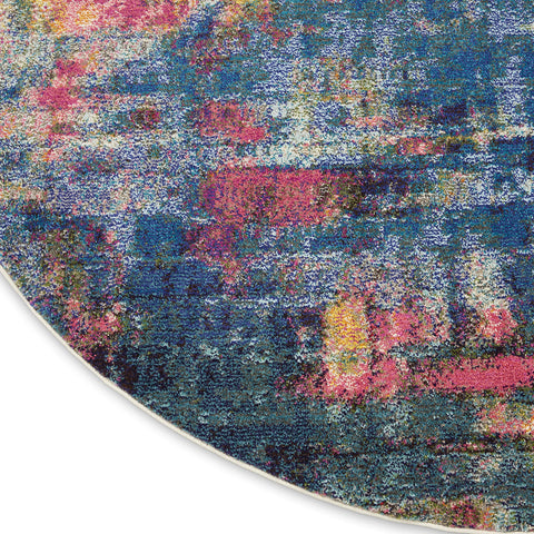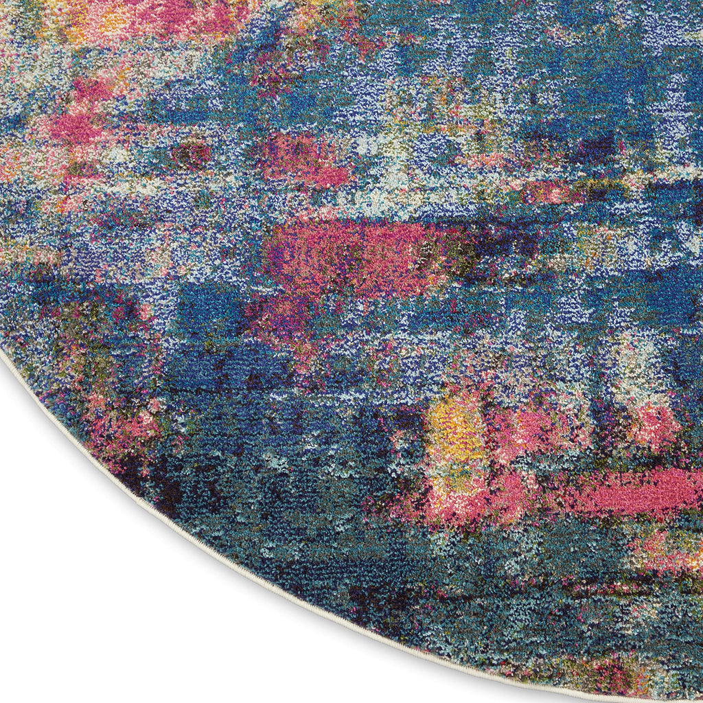 Details: Cosmic consciousness inspires the Celestial Collection by Nourison. These heavenly area rugs possess a dramatic beauty, with rich, saturated colors that swirl together in unique and vivid designs. Each stunning area rug conveys a sense of movement and energy that verges on divine. A true statement piece for your home, this blue and yellow abstract design from the Celestial rug collection evokes images of darkness giving way to light. The striated yellow and red has the dreamy aura of reflections on a deep navy field, imbuing this modern rug with a surreal beauty that's sure to impart an artistic aesthetic into your interior design.Features : Abstract rug in striated tones of blue, orange, and pinkMedium, 0.5-inch thick cut pile feels wonderfully soft underfootMachine made of durable, easy-clean polypropylene fibersRug pad recommendedOEKO-TEX CertifiedSpecifications : Material : 100% PolypropyleneProduct Color : Blue/YellowSize : 94.00" x 94.00" x .50"Shape : Round