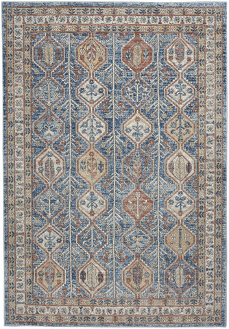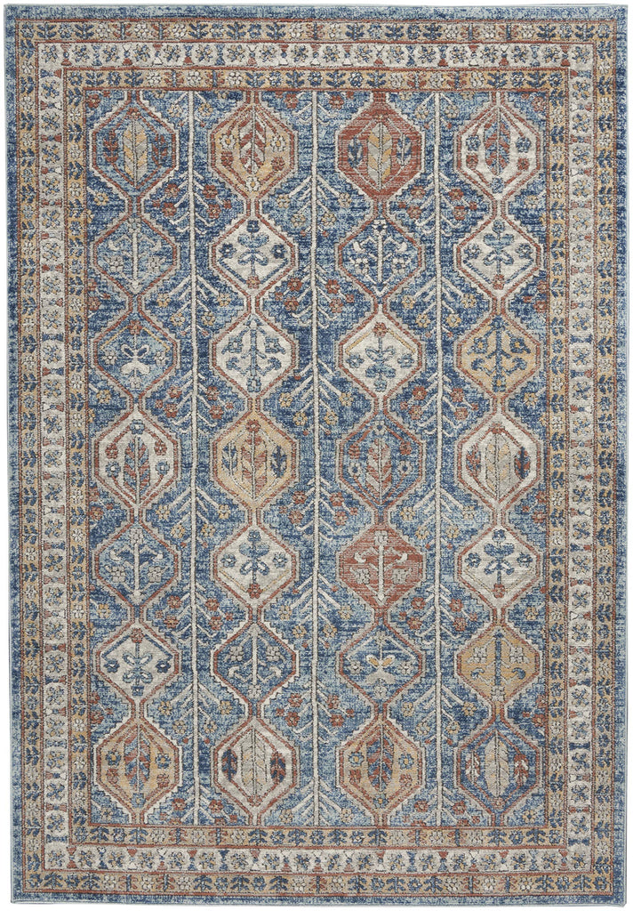 - Rich blue, orange and gold multicolor is a versatile fit for boho and contemporary décor