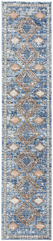 Details: A bold trio of diamonds centers this exciting, Moroccan-inspired area rug from the Concerto Collection. Elegant and versatile in a stunning mineral palette of lapis blue with details in orange, gold and ivory, this power-loomed rug delivers texture and comfort with its thick cut-pile and soft, easy to clean blend of polyester and polypropylene. A vintage fade, ornamental border and serged edge complement boho, contemporary, and modern styles of decor.Features : Materials: 80% Polypropylene, 20% PolyesterFinish: BluePile Description: LowConstruction: Machine madeConstruction Technique: Power-loomedShedding: Moderate sheddingNon-Slip Back: NoRecommended for areas with moderate foot trafficBorder: Ornamental borderIndoor onlySpecifications : Product Dimensions : 0.32"H x 26"W x 120"DProduct Weight : 8.82 lbsShape : Runner
