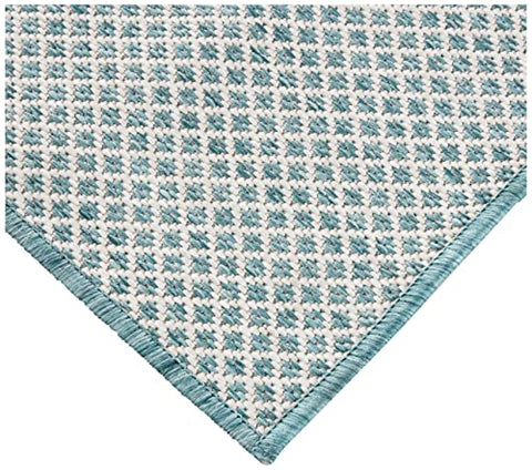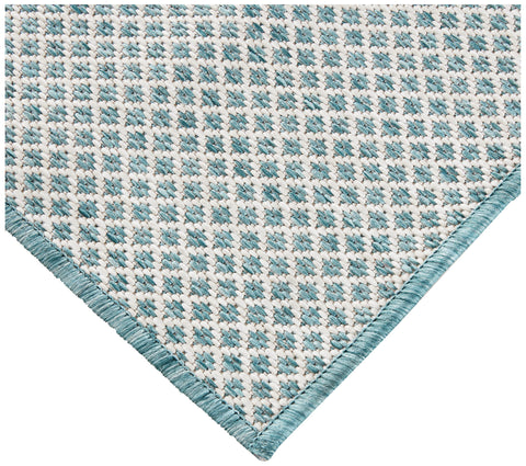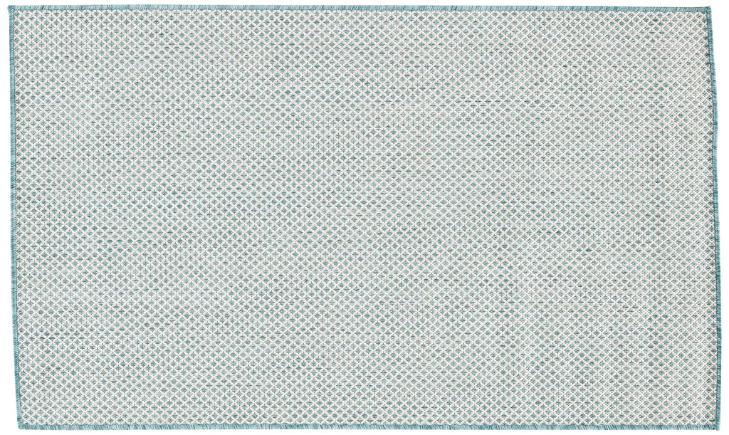 Details: Set a warm and relaxing tone with the Courtyard Collection. These elegantly understated indoor/outdoor rugs feature subtly textured geometric patterns in fashionable palettes designed to anchor modern and contemporary decor. Flat woven polypropylene fibers stand up to heavy traffic and are easy to clean: simply hose-rinse and air dry. Courtyard rugs are ideal for your porch, patio, or any indoor space. With its striking geometric pattern in ivory and aqua blue, this Courtyard Collection indoor/outdoor rug exudes contemporary style. Its subtly textured surface is crafted in classic ivory and aqua blue for a seamless complement to modern settings. Machine made polypropylene flat weave stands up to heavy traffic and is easy to clean: just hose-rinse and air dry.