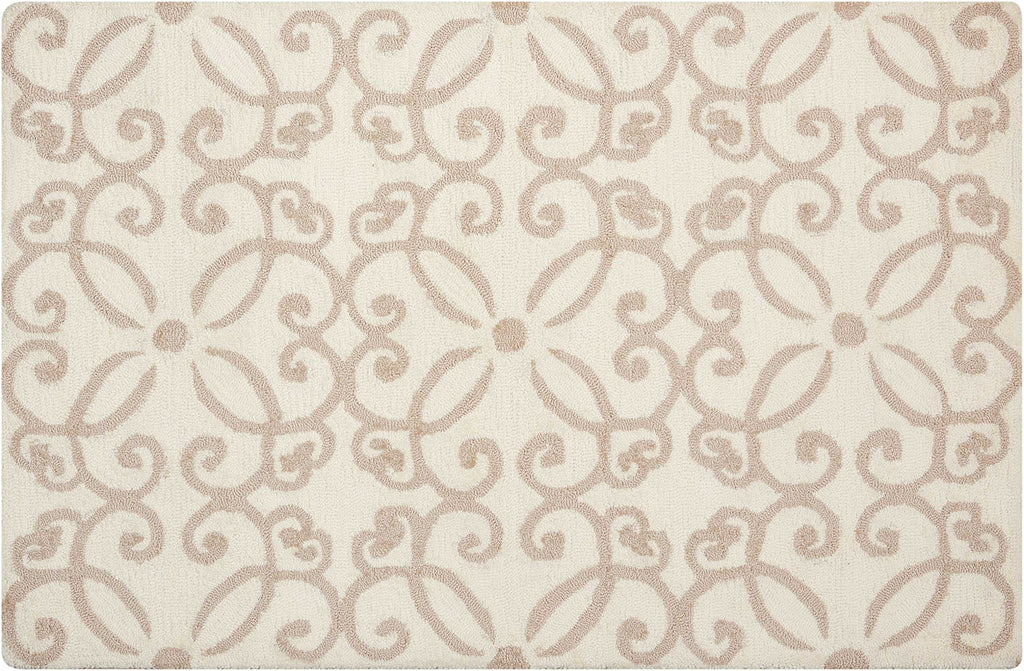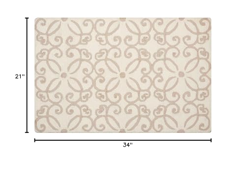 Details: A scrolling arabesque design in delicate tones of elegant cream. A charming accent rug for today's sense of upbeat style. Expertly machine-tufted from premium polyester yarns, precision-printed for vibrant and lasting color.