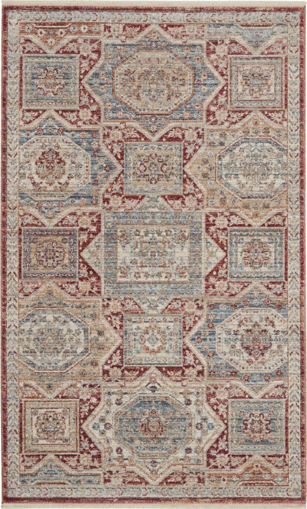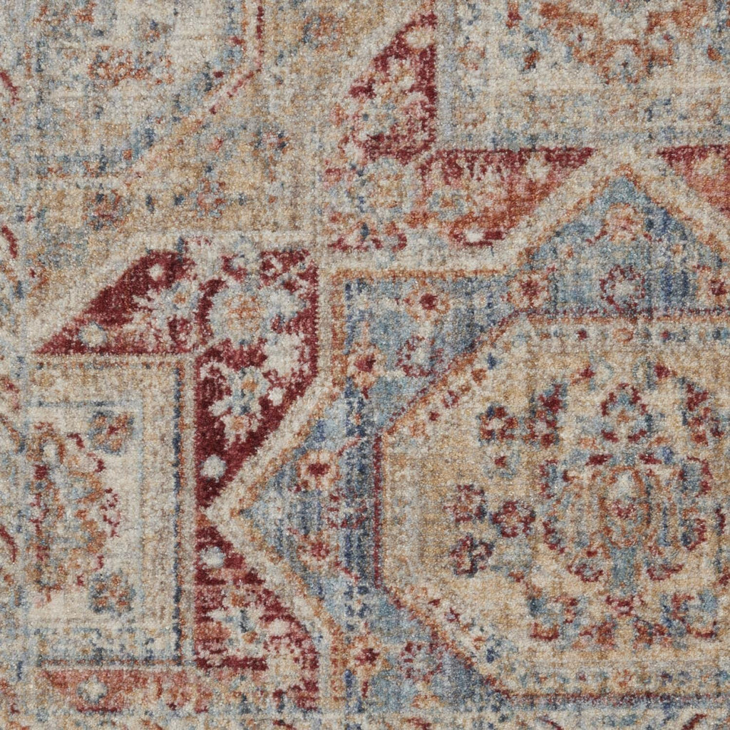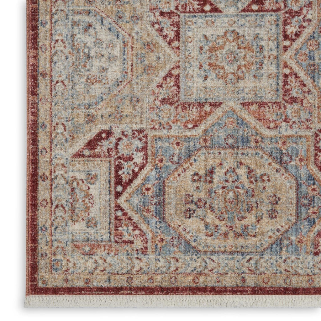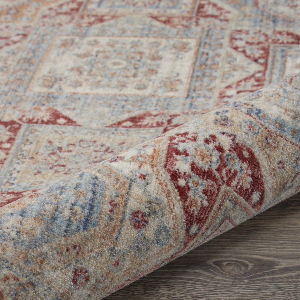 Details: Enchanting Home presents a collection of Persian-inspired area rugs created for today’s lifestyle. The traditional geometric and floral motifs are softly woven with modern, non-shed fibers and finished with classic borders and a small, unfussy fringe. Its palette of soft colors is gently faded for a distressed vintage look that adds warmth and subtle sheen to a favorite bedroom, living room, family room or other gathering space. Enchanting Home rugs are protected by Nouri-Guard fiber protectant that repels most food, beverage, dirt, water and oil-based stains. Keep your home looking its best with a family-friendly Enchanting Home rug and Nouri-Guard protection! This Enchanted Home selection features an elegant repeat pattern of six-sided shields, anchored by a center medallion and bordered in classic Persian rug style. Delicate detailing and vintage fading add warmth to the soft and dense low pile. Luminous in light blue on warm brick; with stain-repellant Nouri-Guard protection.