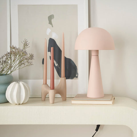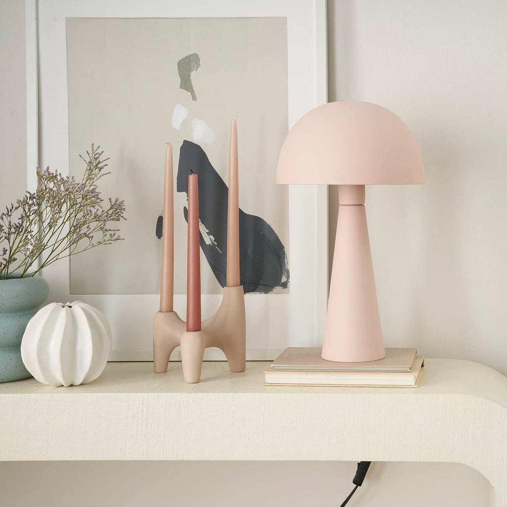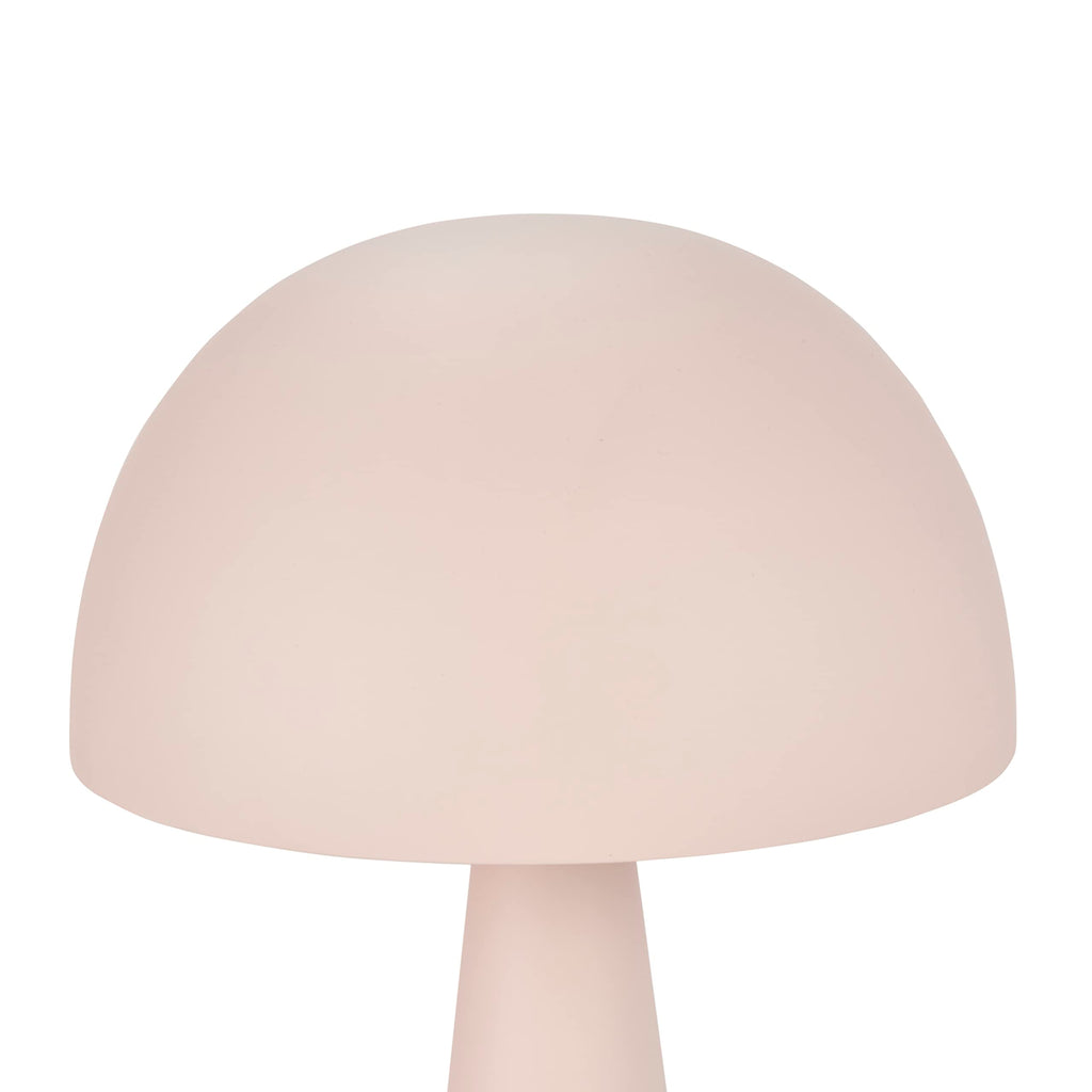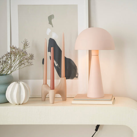 - Small, iron mushroom lamp with domed shade and tapered, column-style base