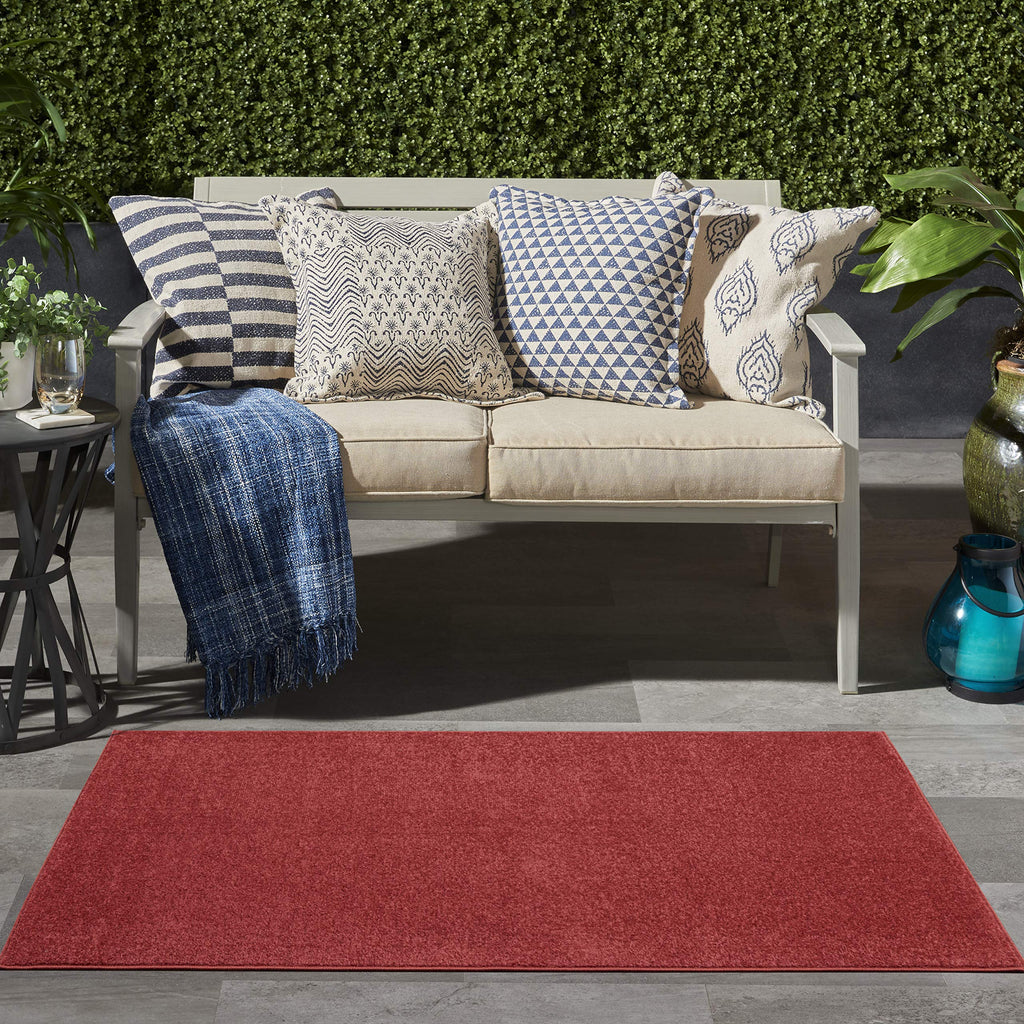 Details: Busy, active lifestyles demand fuss-free décor, and this outdoor rug collection has it all. Nourison Essentials area rugs give you everything you want, and more! These handsome, solid color and patterned area rugs are crafted for rugged performance, but never sacrifice style for function. With a low cut pile, each Essentials rug is designed to withstand heavy traffic, including kids and pets. You'll appreciate the durability, easy care, and soft texture of this contemporary rug collection in a wide range of colors and sizes to fit every indoor and outdoor space. Ideal for your porch, patio, balcony, poolside and deck, or living room, dining room, and other gathering places. 100% polypropylene fibers can be vacuumed, hose-rinsed and air-dried. For even longer life, bring indoors during extreme weather. Here's an outdoor area rug by Nourison Essentials that has it all. Enjoy rugged durability, easy care, and soft hand feel in a rug designed for the active lifestyle. This contemporary, borderless area rug in rich brick red comes in a wide range of sizes to fit every outdoor space. Machine made with a low pile and serged edge, it will withstand heavy traffic without sacrificing comfort. An ideal choice for porch, patio, balcony, poolside and deck, or living room, dining room, family room and other gathering place around your home. This 100% polypropylene rug can be vacuumed, hose-rinsed and air-dried. To extend its life, bring it indoors during extreme weather.