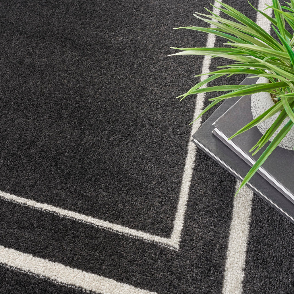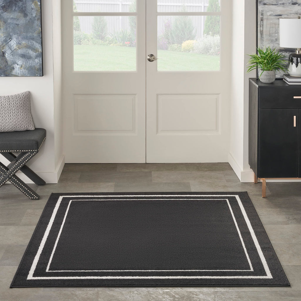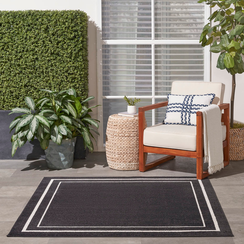 Details: Busy, active lifestyles demand fuss-free décor, and this outdoor rug collection has it all. Nourison Essentials area rugs give you everything you want, and more! These handsome, solid color and patterned area rugs are crafted for rugged performance, but never sacrifice style for function. With a low cut pile, each Essentials rug is designed to withstand heavy traffic, including kids and pets. You'll appreciate the durability, easy care, and soft texture of this contemporary rug collection in a wide range of colors and sizes to fit every indoor and outdoor space. Ideal for your porch, patio, balcony, poolside and deck, or living room, dining room, and other gathering places. 100% polypropylene fibers can be vacuumed, hose-rinsed and air-dried. For even longer life, bring indoors during extreme weather. Add color and definition to your patio conversation space or indoor area with this contemporary black outdoor rug from the Nourison Essentials Collection. The double bordered rug design is made with softly textured, low-profile polypropylene yarns that stand up to heavy foot traffic. An ideal choice for busy households, this kid and pet-friendly rug does not shed and cleans up easily: hose-rinse spills and air-dry. To extend the life of your rug, bring it inside during extreme weather.