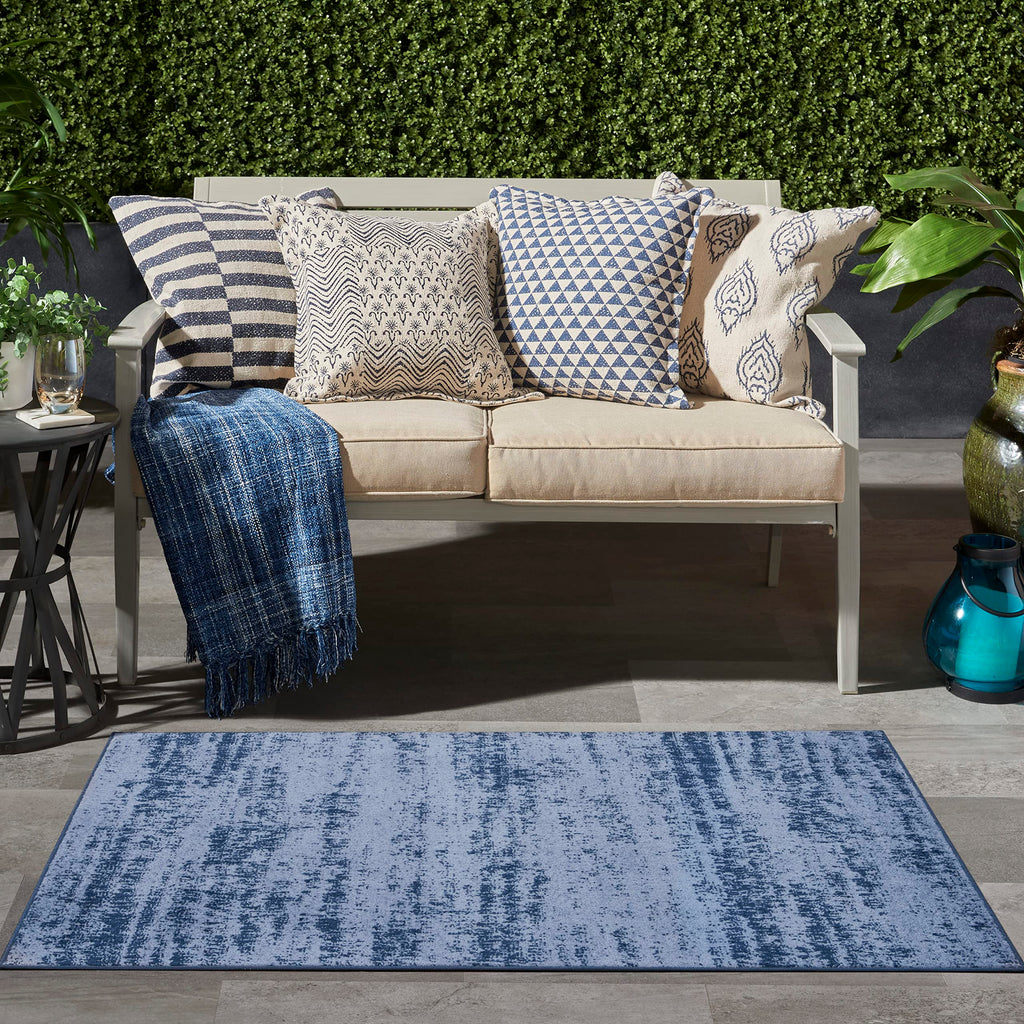 Details: Busy, active lifestyles demand fuss-free décor, and this outdoor rug collection has it all. Nourison Essentials area rugs give you everything you want, and more! These handsome, solid color and patterned area rugs are crafted for rugged performance, but never sacrifice style for function. With a low cut pile, each Essentials rug is designed to withstand heavy traffic, including kids and pets. You'll appreciate the durability, easy care, and soft texture of this contemporary rug collection in a wide range of colors and sizes to fit every indoor and outdoor space. Ideal for your porch, patio, balcony, poolside and deck, or living room, dining room, and other gathering places. 100% polypropylene fibers can be vacuumed, hose-rinsed and air-dried. For even longer life, bring indoors during extreme weather. Bring chic style to your indoor or outdoor seating areas with this outdoor rug from the Nourison Essentials Collection. Featuring a simple abstract design, this modern rug is presented in a classic, denim blue color that easily complements neutral decor. Essentials is machine-made from durable, low-profile polypropylene yarns that can be vacuumed, hose-rinsed, and air-dried. To extend the life of your rug, bring it inside during extreme weather.
