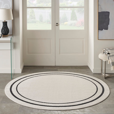 Details: Busy, active lifestyles demand fuss-free décor, and this outdoor rug collection has it all. Nourison Essentials area rugs give you everything you want, and more! These handsome, solid color and patterned area rugs are crafted for rugged performance, but never sacrifice style for function. With a low cut pile, each Essentials rug is designed to withstand heavy traffic, including kids and pets. You'll appreciate the durability, easy care, and soft texture of this contemporary rug collection in a wide range of colors and sizes to fit every indoor and outdoor space. Ideal for your porch, patio, balcony, poolside and deck, or living room, dining room, and other gathering places. 100% polypropylene fibers can be vacuumed, hose-rinsed and air-dried. For even longer life, bring indoors during extreme weather. Add color and definition to your patio conversation space or indoor area with this contemporary ivory and black outdoor rug from the Nourison Essentials Collection. The double bordered rug design is made with softly textured, low-profile polypropylene yarns that stand up to heavy foot traffic. An ideal choice for busy households, this kid and pet-friendly rug does not shed and cleans up easily: hose-rinse spills and air-dry. To extend the life of your rug, bring it inside during extreme weather.