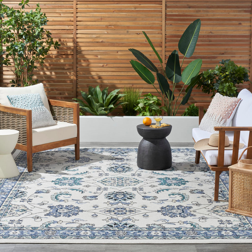 Details: Busy, active lifestyles demand fuss-free décor, and this outdoor rug collection has it all. Nourison Essentials area rugs give you everything you want, and more! These handsome, solid color and patterned area rugs are crafted for rugged performance, but never sacrifice style for function. With a low cut pile, each Essentials rug is designed to withstand heavy traffic, including kids and pets. You'll appreciate the durability, easy care, and soft texture of this contemporary rug collection in a wide range of colors and sizes to fit every indoor and outdoor space. Ideal for your porch, patio, balcony, poolside and deck, or living room, dining room, and other gathering places. 100% polypropylene fibers can be vacuumed, hose-rinsed and air-dried. For even longer life, bring indoors during extreme weather. Whether you’re looking to bring a more welcoming vibe to your outdoor conversation spaces or need a stylish yet fuss-free way to refresh your indoor décor, this Persian-inspired rug from the Nourison Essentials collection has you covered. This versatile outdoor rug showcases a traditional floral pattern and matching border in bold blue and grey tones sure to wow family and friends alike. Made from 100% polypropylene for easy cleaning: just hose rinse and air dry. OEKO-TEX certified.