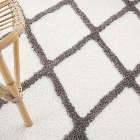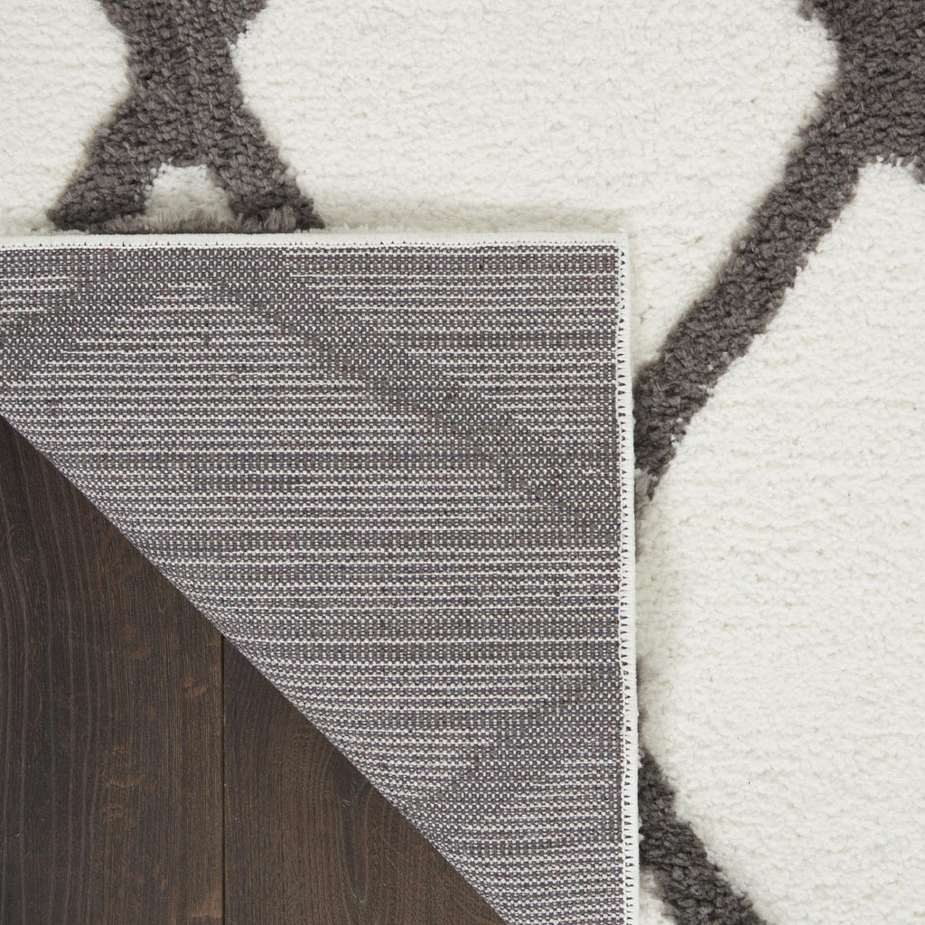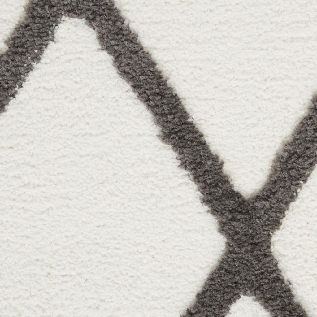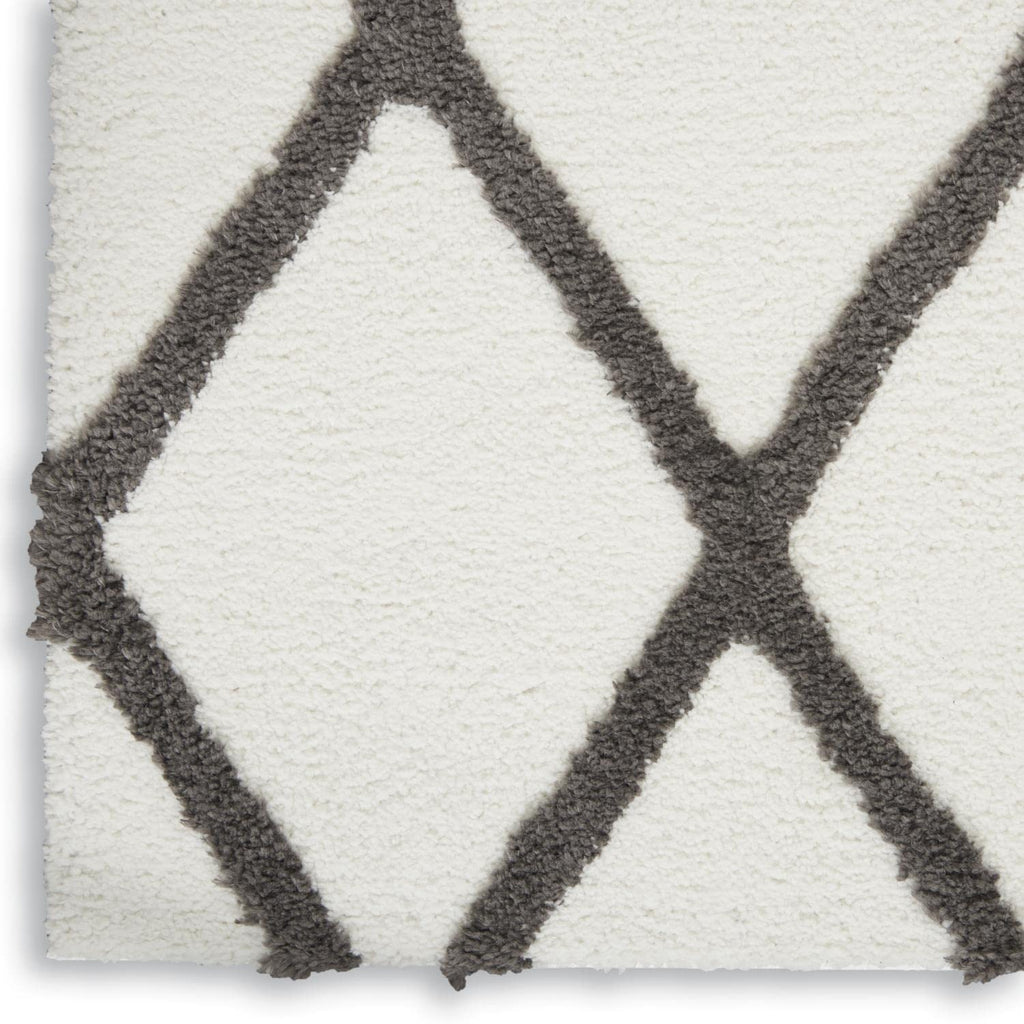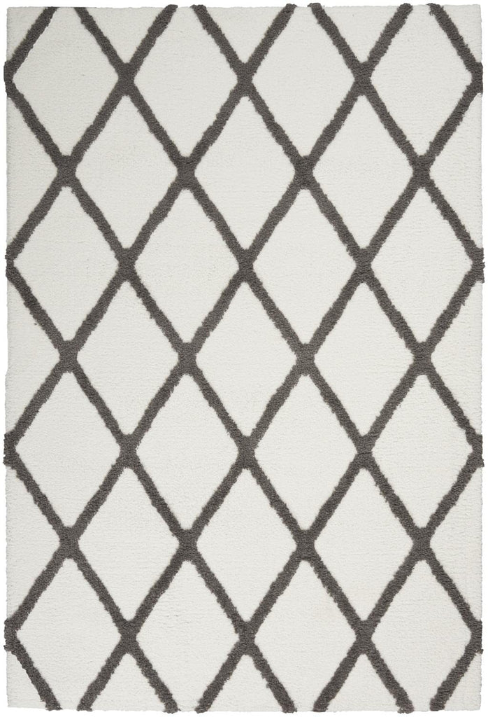 Details: As pleasant to look at as it is to walk on, this contemporary shag rug from the Feather Soft Collection features a shimmering raised trellis design in charcoal gray on an ivory ground. Machine tufted polyester fibers offer pleasingly soft texture underfoot, making it an excellent addition to your living room, bedroom, or home office.Features : Materials: 100% PolyesterFinish: Ivory charcoalPile Description: LowConstruction: Machine MadeConstruction Technique: TuftedRectangle shapeShedding: Low sheddingNon-Slip Back: NoRecommended for areas with moderate foot trafficBorder: Borderless designIndoor onlySpecifications : Product Dimensions : 0.25"H x 63"W x 87"DProduct Weight : 12 lbs
