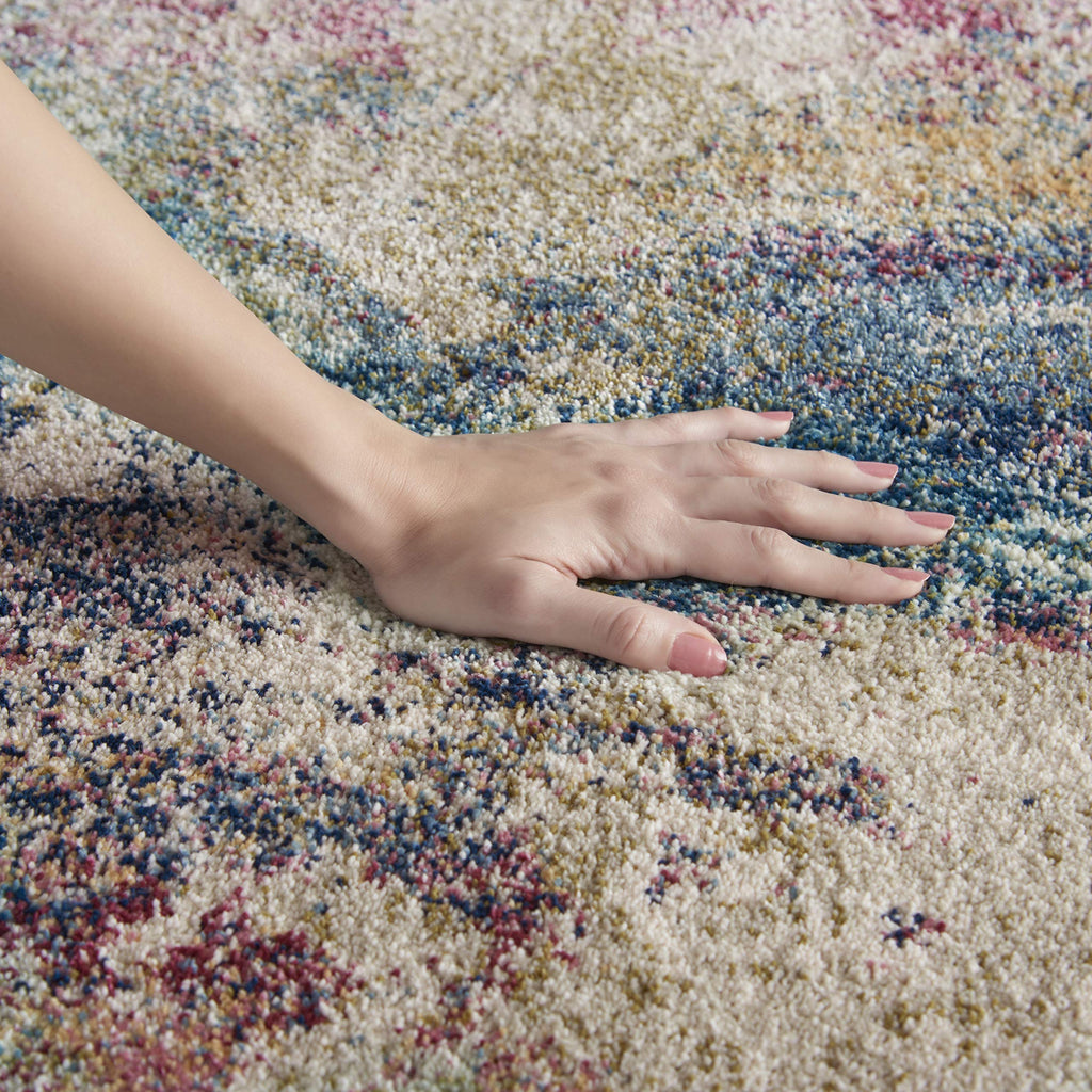 Details: The Fusion Collection by Nourison brings elements from contemporary and traditional rug designs together in rich blues, vibrant pinks and elegant neutrals. Persian floral patterns and abstract brush strokes play out on silky, plush pile, with distressed color effects to create a vintage appeal. There's a style for any room in your home! This Fusion Collection rug from Nourison features luxurious low-pile shag and a swirl of floral-inspired abstract patterns that will add depth of color and texture anywhere in your home. This plush rug features rich ivory white pile accented with fucsia, blue, and gold, with easy-care and extra-soft fibers for a touch of texture and luxury for your favorite room.