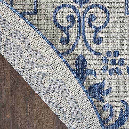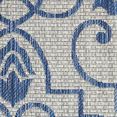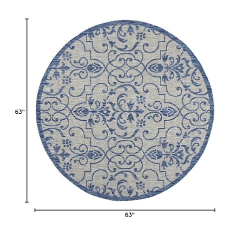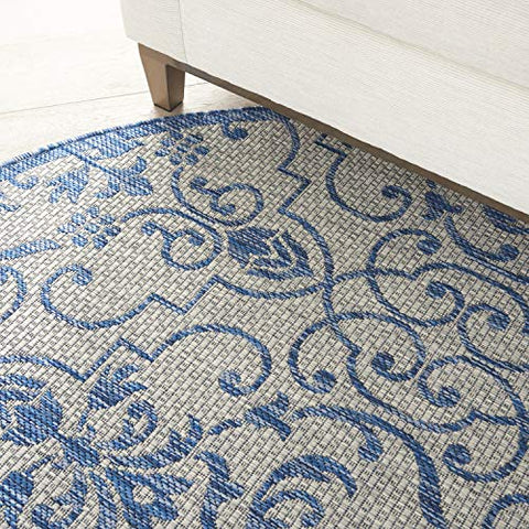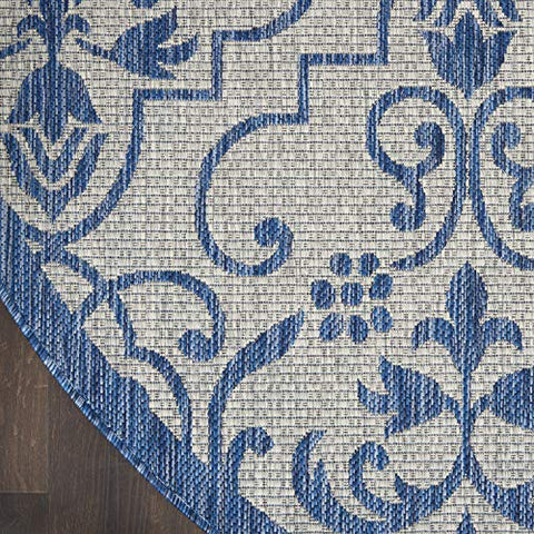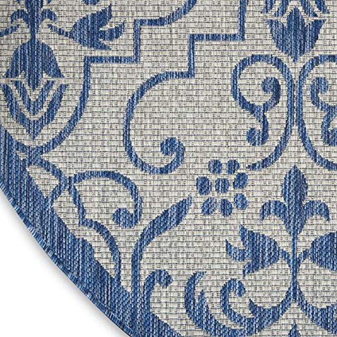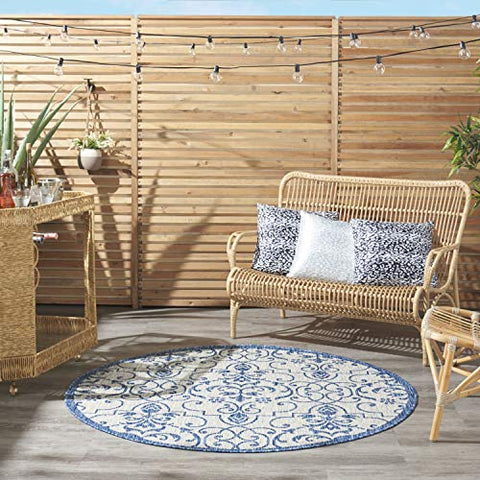 Details: Stunning in its chic simplicity, the Garden Party Collection of indoor/outdoor area rugs from Nourison is flat woven for splendid tone, texture, and durability. Featuring a range of marvelous neutral color palettes in classic and contemporary designs, these remarkable rugs will slip seamlessly into any setting.Features Holds up well even under heavy outdoor foot trafficEasy cleaning and maintenance - just rinse with hose and air-dryColors may vary in appearance from sunlight to indoor lightingDue to the detailed construction of our rugs, both handmade and machine-made, sizes may vary by up to three inches in width or length.Rug pad recommendedBrand: NourisonCollection: Garden PartyColor: Ivory BlueSize: 5'3" x roundShape: RoundConstruction: Machine madeConstruction Technique: Power-loomedMaterial: 100% PolypropyleneShedding: Low sheddingNon-Slip Back: NoLatex Free: NoBacking: LatexBorder: Narrow borderMade In Turkey