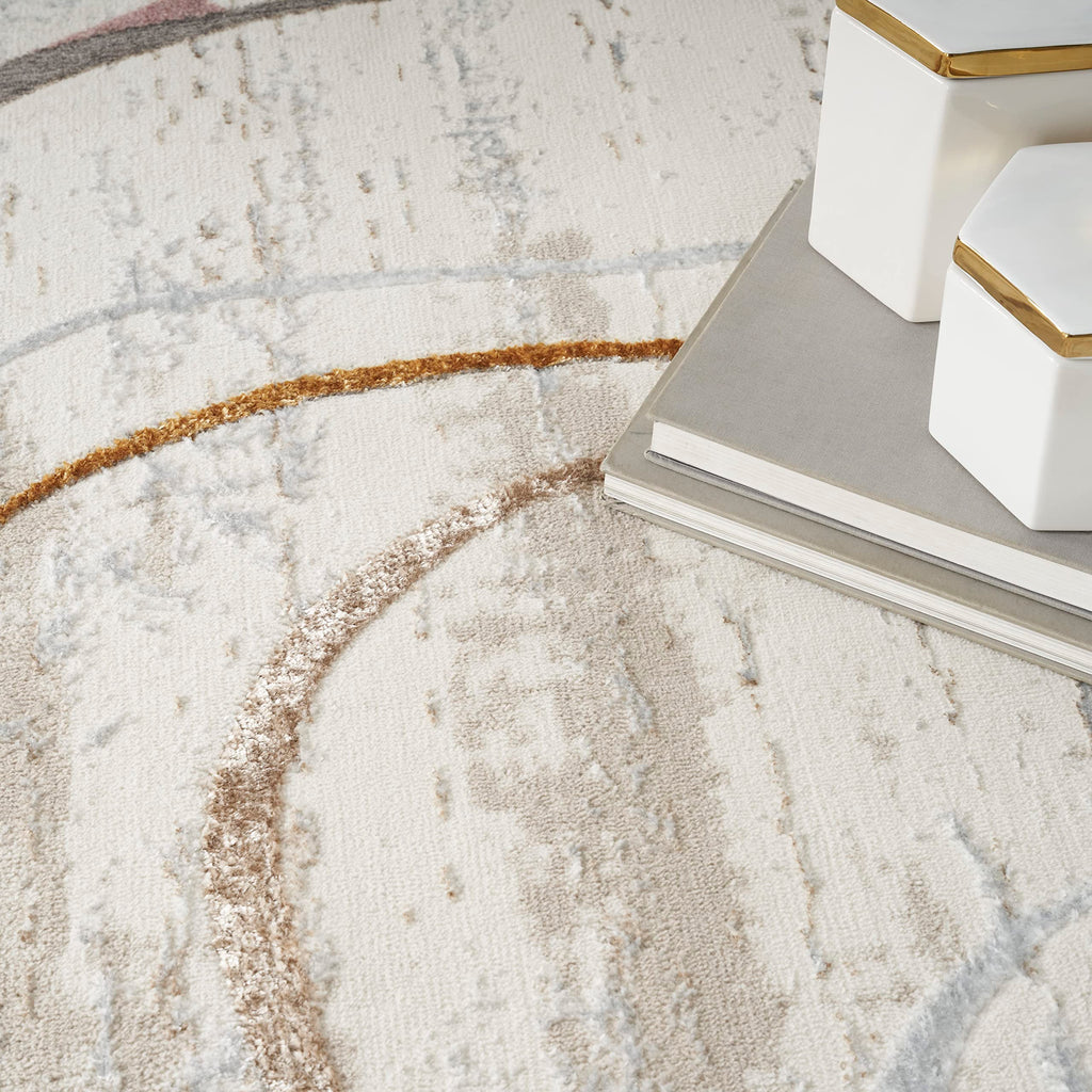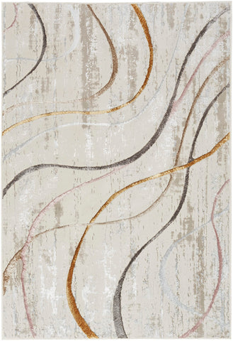 Details: The Glam Area Rug Collection embodies contemporary style. Art Deco inspired, abstract, and geometric rug patterns are finished with subtly raised accents and a glamorous shimmer that adds a brilliant look to your living room, dining room, or bedroom décor. Made from softly textured polyester yarns for easy cleaning, Glam is ideal for use in busy households with kids and pets. With its curvy linear pattern in pink, gold, grey, and taupe on an ivory ground, this abstract rug from the Glam Collection adds a sense of movement to your décor. The contemporary design is enhanced with subtly raised accents and a shimmer that beautifully reflects changes in light. Machine-made from polyester yarns that feel comfortably soft underfoot.