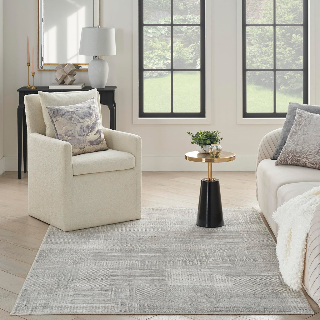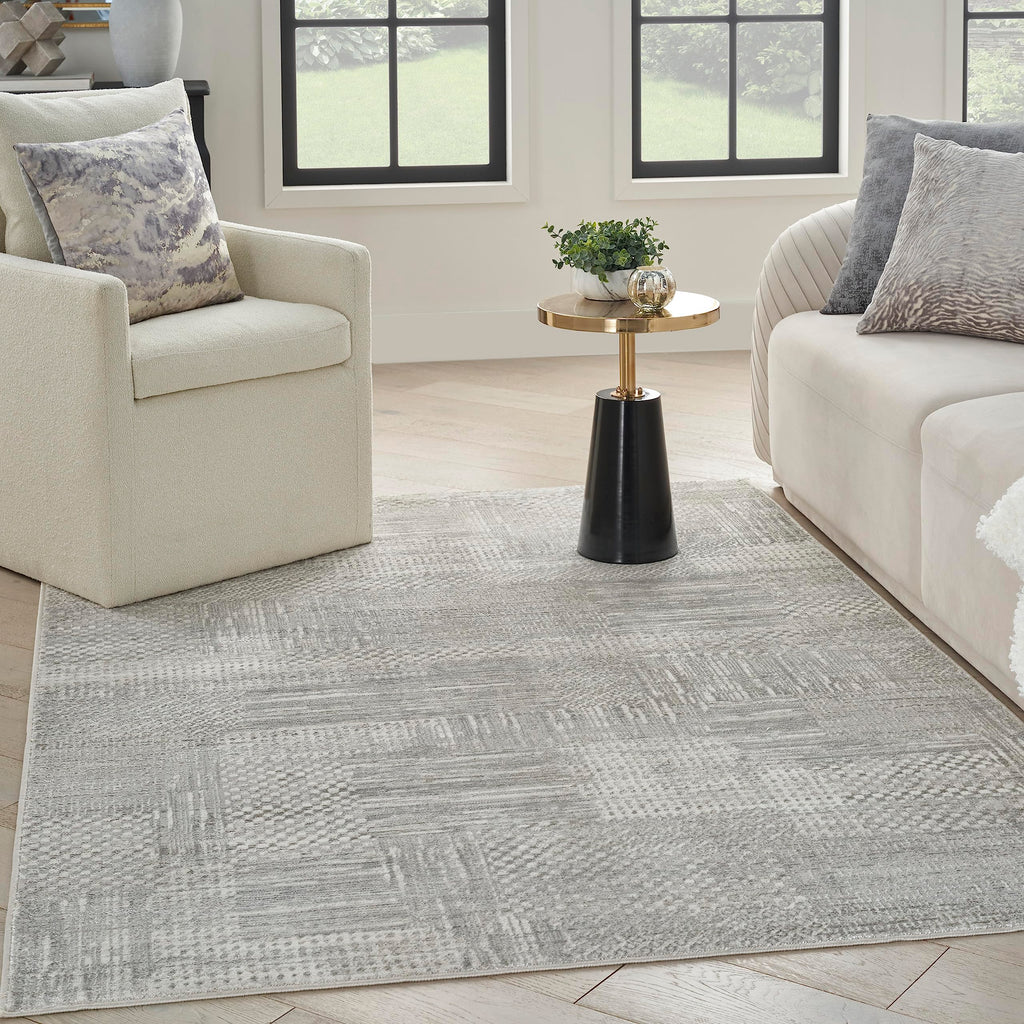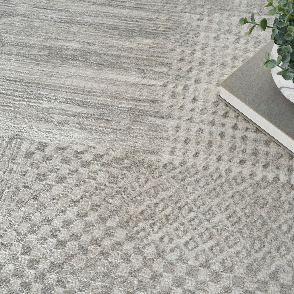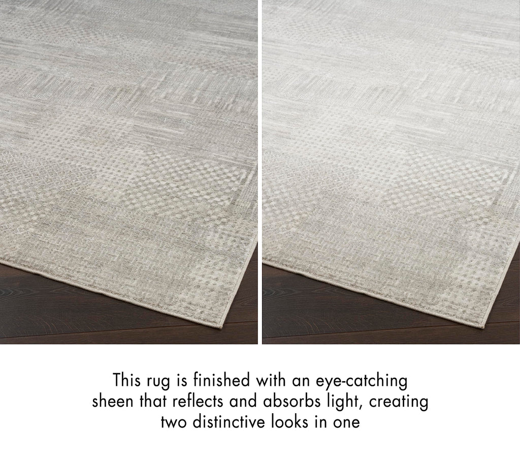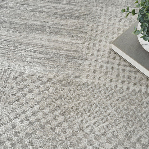 Details: The Glam Area Rug Collection embodies contemporary style. Art Deco inspired, abstract, and geometric rug patterns are finished with subtly raised accents and a glamorous shimmer that adds a brilliant look to your living room, dining room, or bedroom décor. Made from softly textured polyester yarns for easy cleaning, Glam is ideal for use in busy households with kids and pets. Bring refreshing style to your home with this abstract rug from the Glam Collection. The patchwork of lines and geometric patterns is presented in understated shades of silver and grey, which is enhanced with a luxurious sheen that shifts in tone with changes in ambient light. Made from softly textured polyester yarns that are easy to clean.