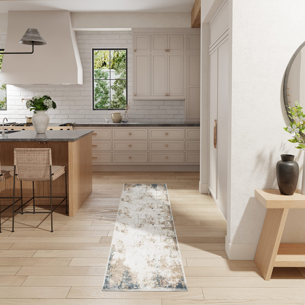Details: The Glam Area Rug Collection embodies contemporary style. Art Deco inspired, abstract, and geometric rug patterns are finished with subtly raised accents and a glamorous shimmer that adds a brilliant look to your living room, dining room, or bedroom décor. Made from softly textured polyester yarns for easy cleaning, Glam is ideal for use in busy households with kids and pets. Add chic style to your living room or bedroom with this abstract rug from the Glam Collection. Featuring a modern distressed pattern in taupe, blue, and grey multicolor, this modern rug is enhanced with an eye-catching sheen that shifts in tone under different light. Made from easy-clean, softly textured polyester.