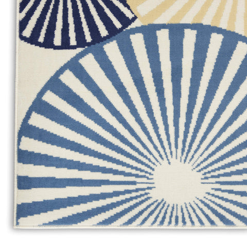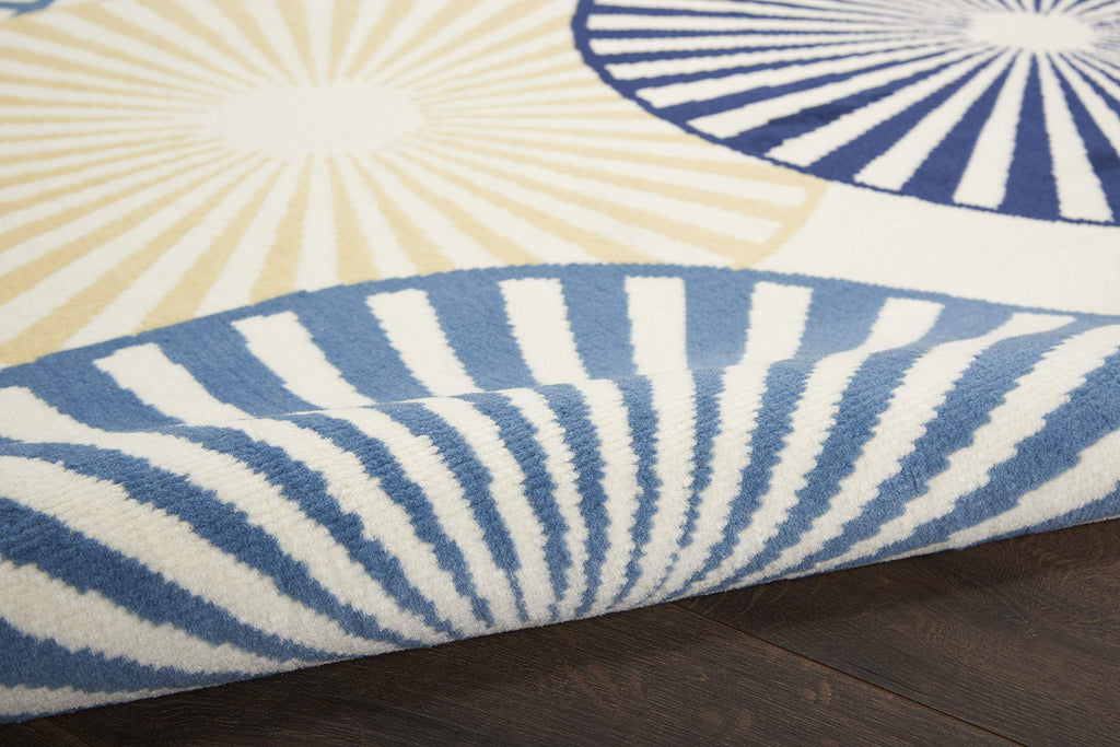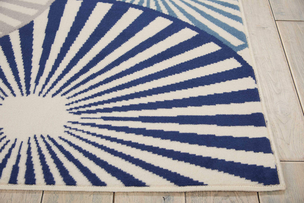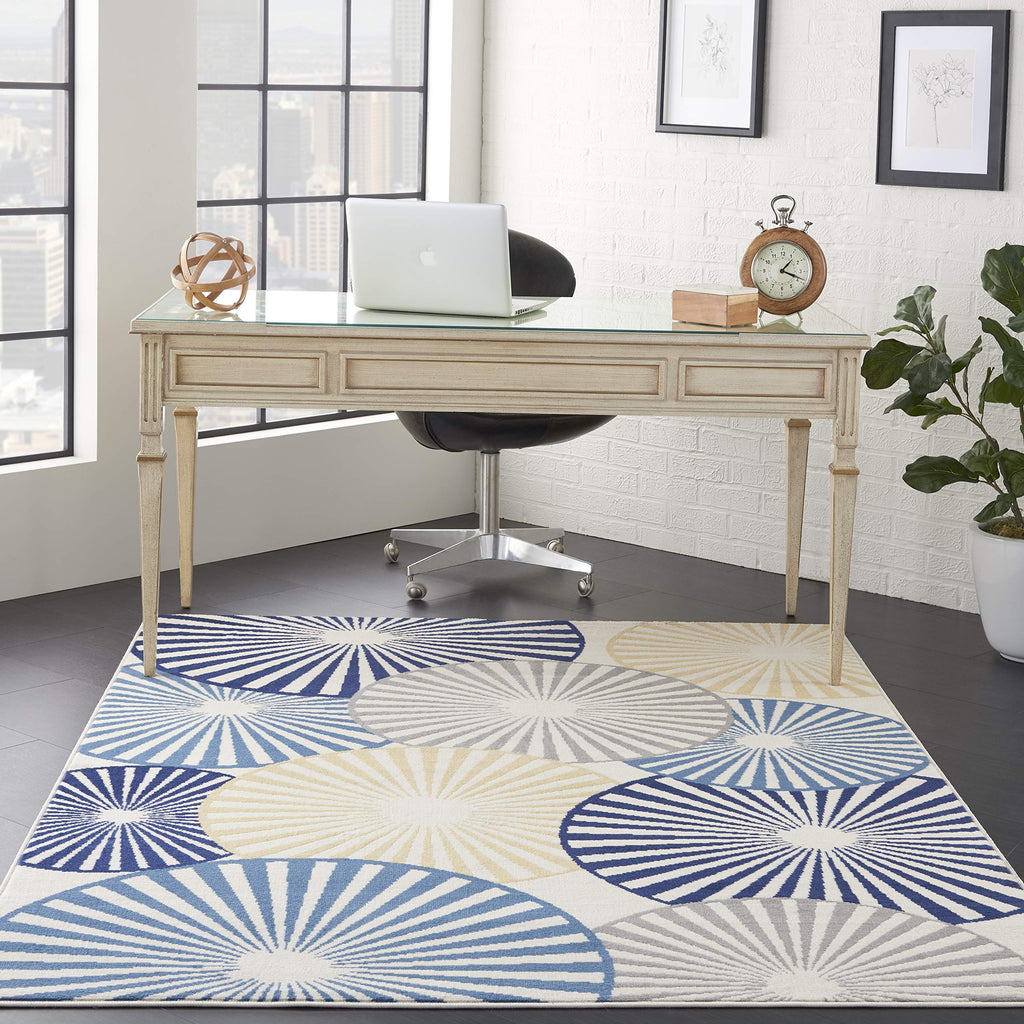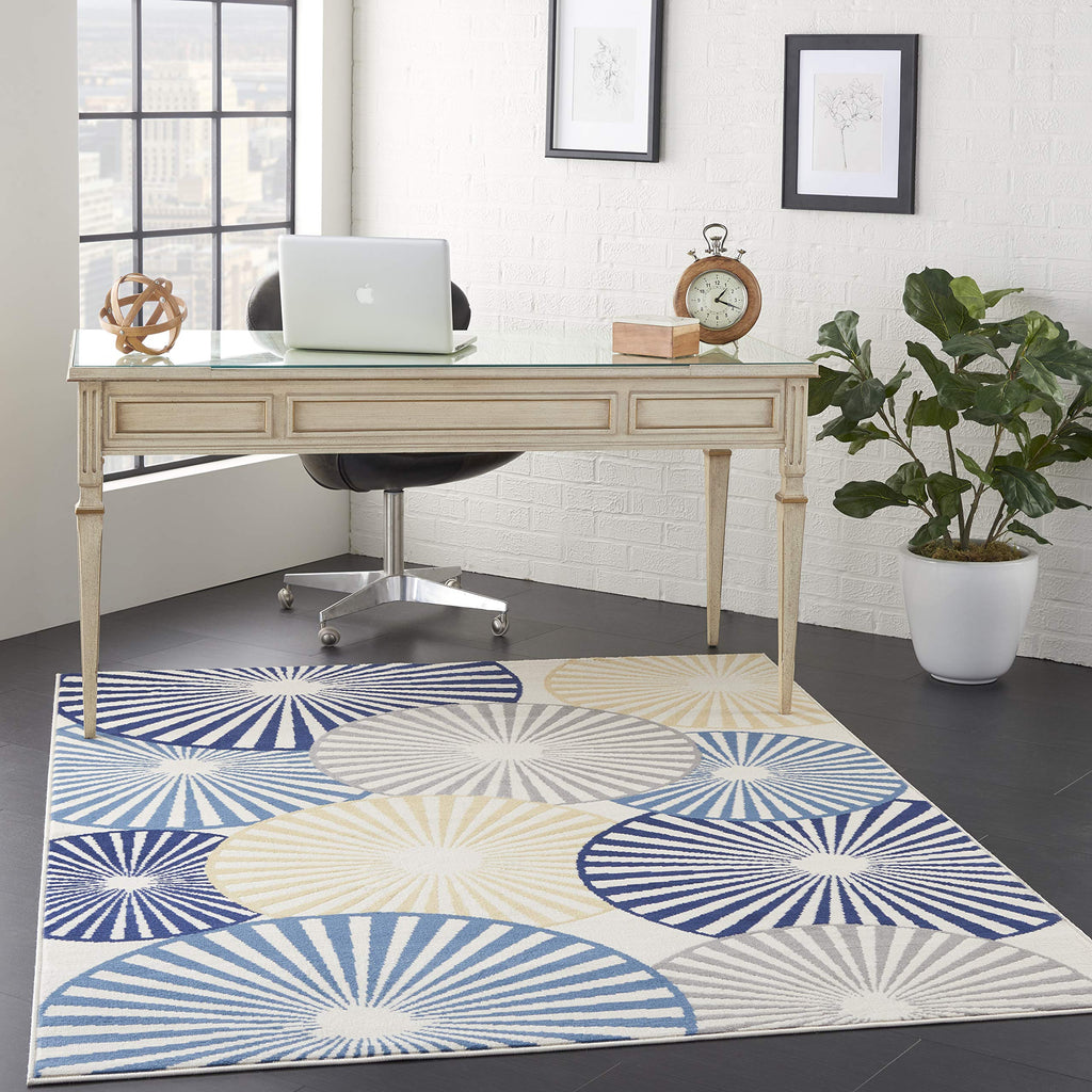 Details: An array of overlapping orbs create captivating energy and vibrance in this Graphix area rug. Radiating circular patterns in soft blue, white, and beige adorn a subtle ivory field in a burst of contemporary flair.