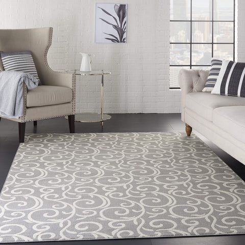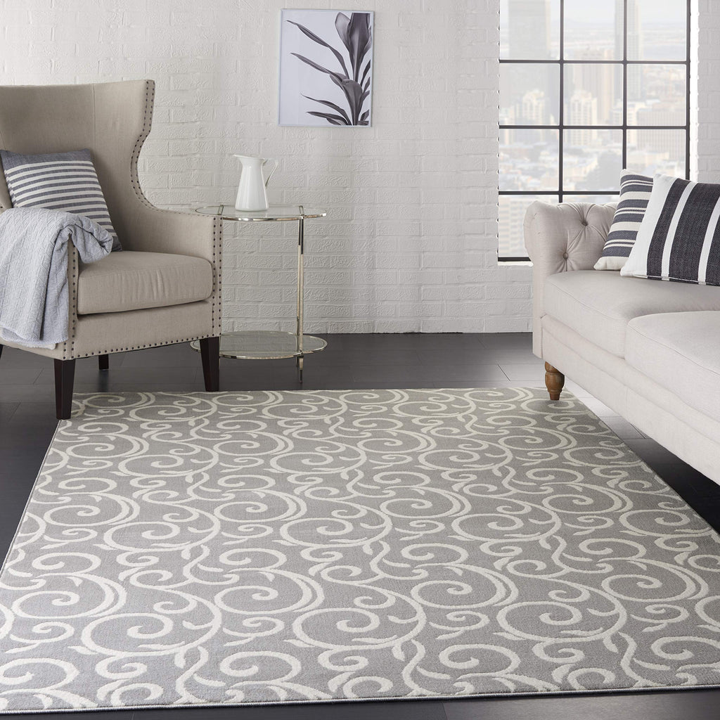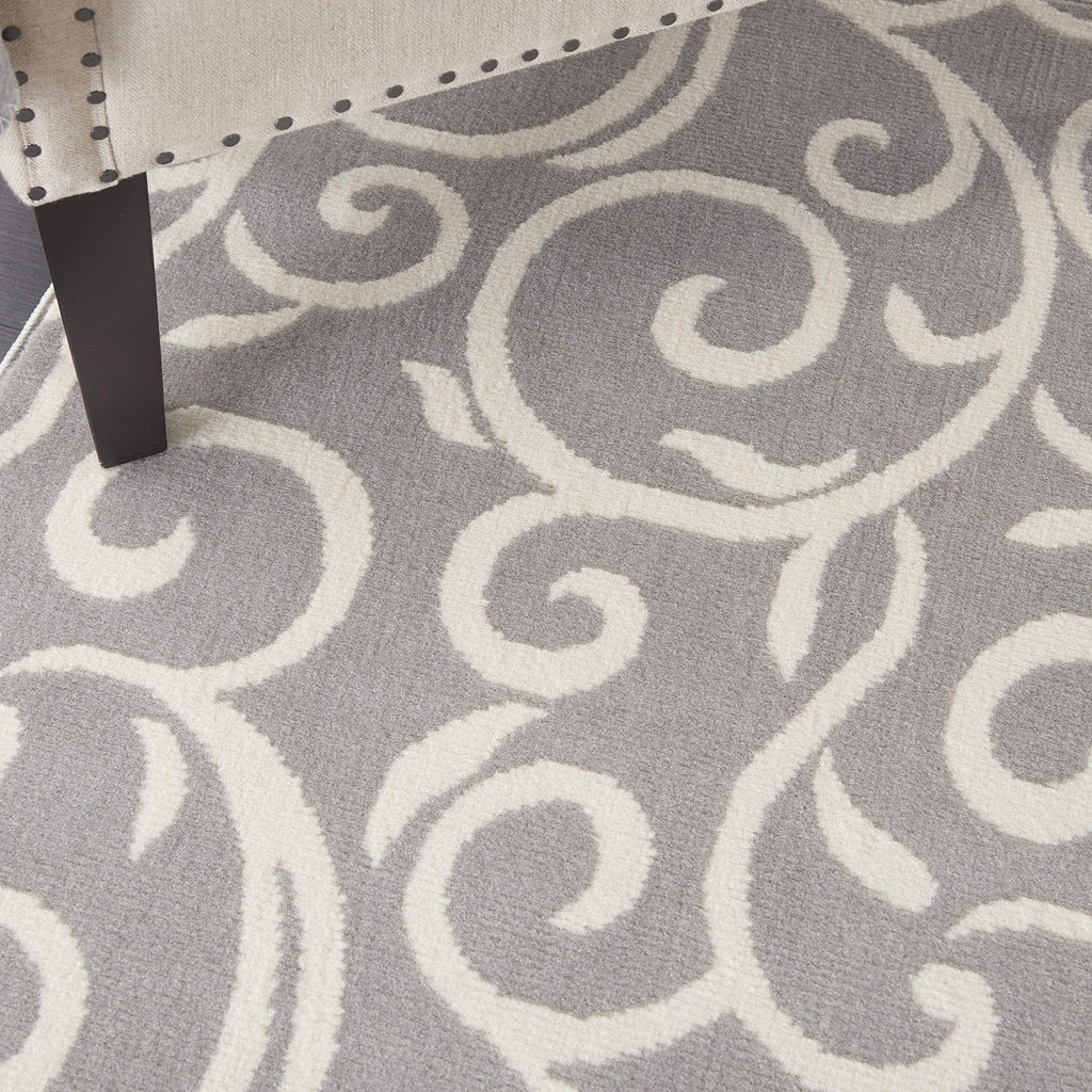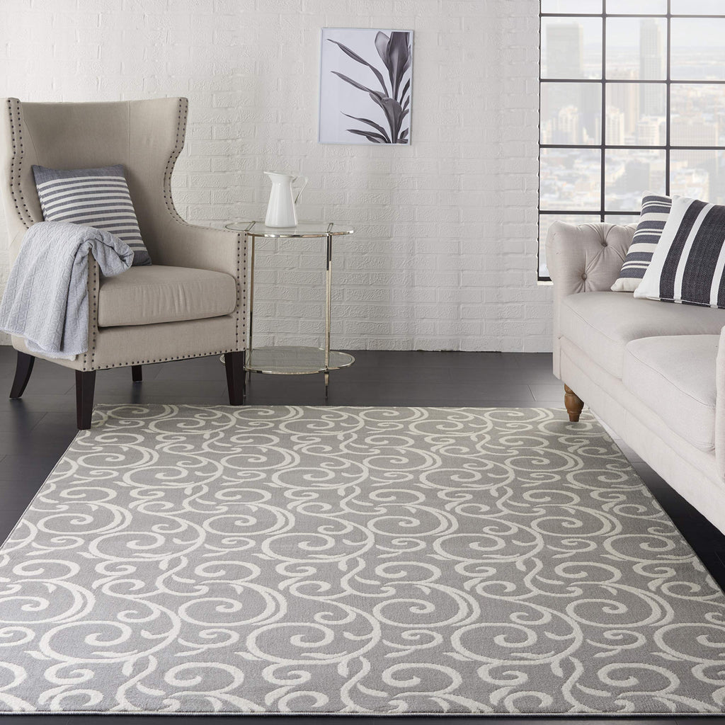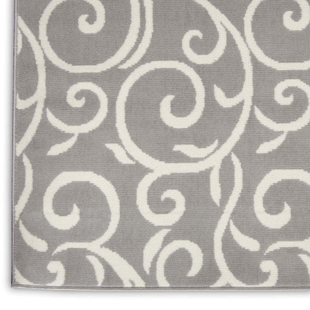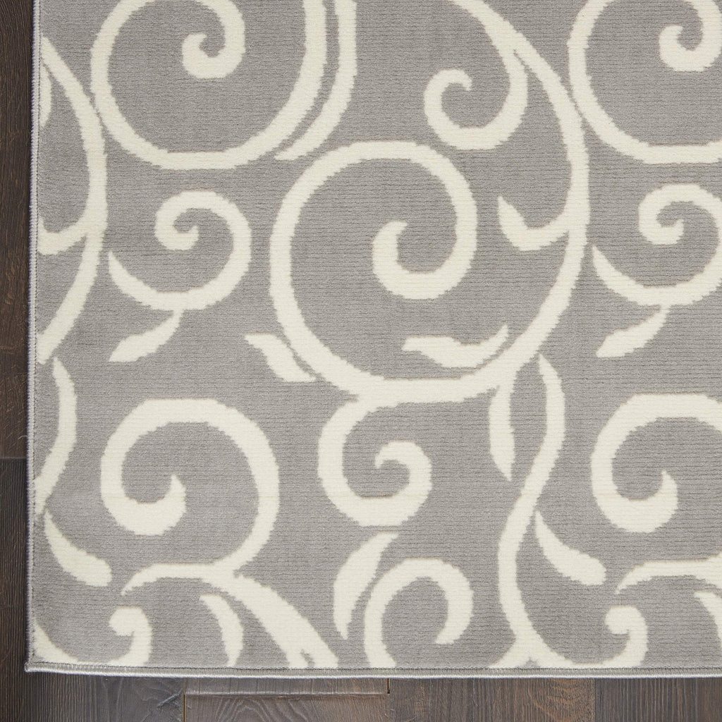 Details: Curling vines form a lush abstract garden in this Graphix Collection area rug. This botanical style rug features ivory patterns on a soft grey field, with voluptuous curves creating a statement of soft comfort with artistic flair.