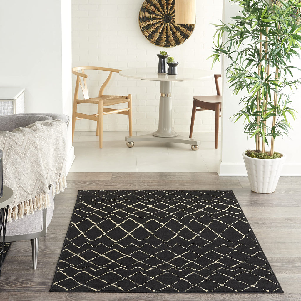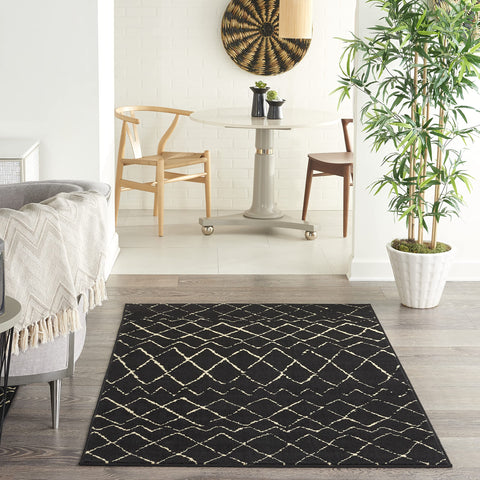 Details: Beautifully bold and gorgeously graphic, the Grafix Collection of area rugs from Nourison is destined to deliver a transfixing touch of dramatic appeal to any room. Available in an enthralling array of contemporary color palettes and power-loomed from long-lasting, easy-care polypropylene, each exciting rug is all about outstanding ease and sensational style. Playful and primitive, this Grafix area rug from Nourison features distressed cream-colored tribal rug patterns on a sumptuous black field. Each rug is power-loomed for simple care, superior wear and a splendid look and feel, and will transform even the most ordinary room into something extraordinary.