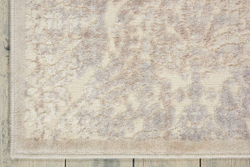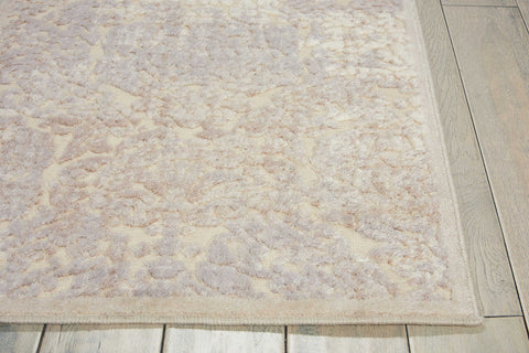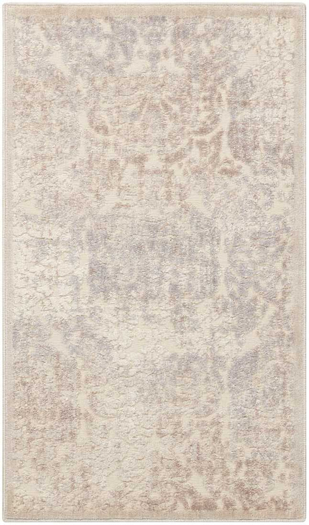 - In this bestseller collection, Nourison features powerloomed craftsmanship with high-low pile construction for exquisite visuals, touchable depth and texture. Made out of 30% polypropylene and 70% acrylic for a unique touch appeal, this traditional Damask design holds grey and ivory colored gradations that will mesh perfectly with your household color scheme. Dry clean or spot clean for best results. Use this accent rug in your kitchen, bedroom, living room or bathroom.