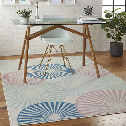 Details: An array of overlapping orbs create captivating energy and vibrance in this Grafix area rug. Radiating circular patterns in soft blue, white, and pink adorn an ivory field in a burst of contemporary flair.