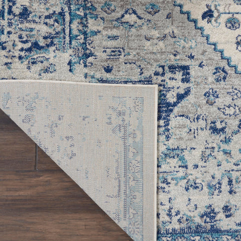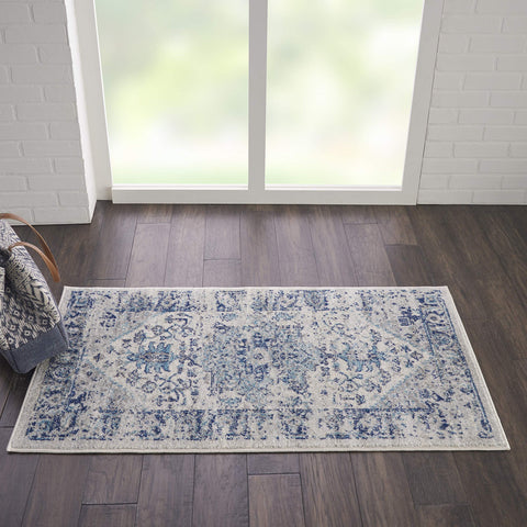 Details: Nourison's Tranquil Collection brings together a palette of soothing and elegant colors into an assortment of contemporary and traditional patterns, ranging from contemporary florals to intricate Persian and Kashan bordered medallion rugs. Each rug features a lush cut pile in easy-care fibers, with subtle abrash tones for touch of calming charm for any decor. A distressed ivory and grey field is adorned with navy blue and a hint of sky blue in this corner-and-medallion Kashan rug design from the Tranquil Collection. Traditional abrash colors lend a vintage flavor to the overall effect, for an antique feel coupled with modern easy-care fibers.