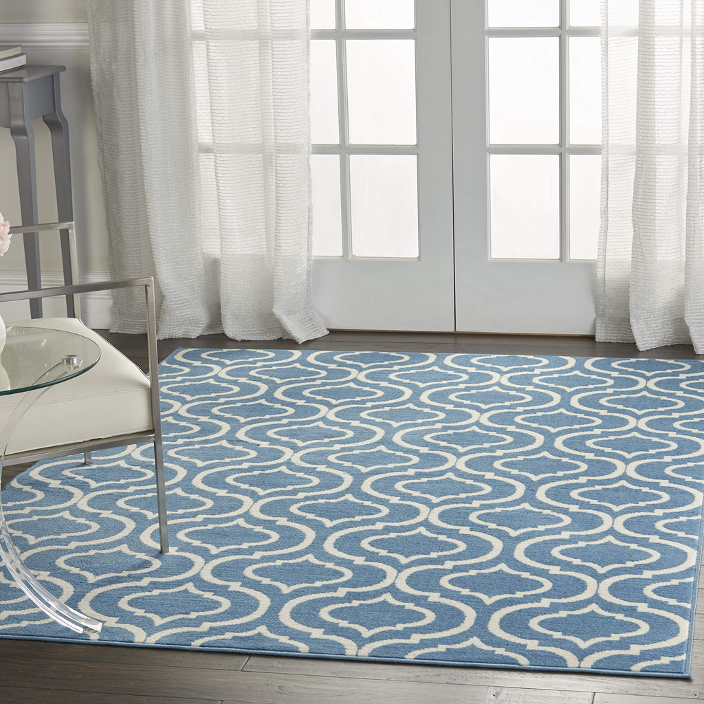Details: Smart and sophisticated, the Jubilant Collection presents contemporary rugs with fresh new looks and modern color palettes. Beautifully appealing in pastel shades of pink, blue, and grey, each rug features a durable low-pile construction from low-maintenance, easy-care fibers that will blend perfectly into any casual boho setting. Introduce a touch of Moroccan flair with this intriguing Jubilant Collection area rug, featuring a lantern trellis pattern. Exotic yet versatile in ivory on blue, with easy-care fibers in a sleek, low-pile construction that brings life and energy to any room in the home.