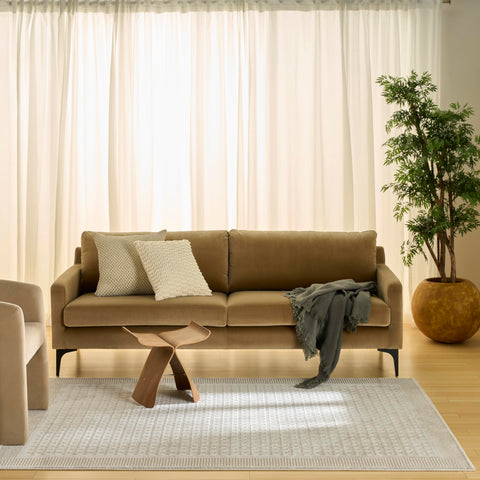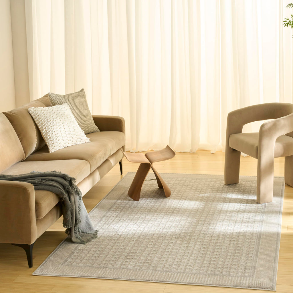 Details: Invite clean, understated elegance to your décor with the Nordic Collection. These abstract and geometric rugs draw inspiration from the principles of Scandinavian design to bring you simple, yet impactful looks that help create a more serene atmosphere. Each style is finished with a subtle sheen and high-low dimensional pile that adds visual appeal without overwhelming your space. Choose from a variety of sizes to create a coordinated look between rooms – from runners for the kitchen and bathroom to large 8x10 rugs for the living room. Bring simple yet sophisticated style to your décor with this beige geometric rug from the Nordic Collection. The tile-like pattern, framed by a linear double border, helps frame your furniture with ease. This modern rug has a silky sheen and high-low dimensional pile for added movement and depth.