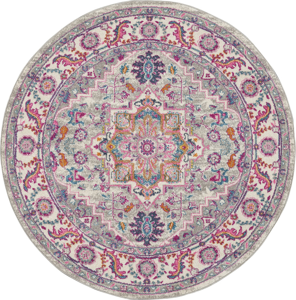 Details: Rich, seductive color draws you into the plush beauty of the Passion Collection. These fantastic florals and dramatic geometric designs meld elements of classic Persian motifs with a bohemian sensibility. Woven from polypropylene fibers on state-of-the-art power looms, this collection of area rugs combines thick, comfortable pile with an easy-care approach. Advanced overdye techniques create an exciting patina effect in shades of pink, blue, and orange. Live a more colorful life with Passion in your home! This timeless Oushak star medallion rug design takes on a contemporary tone with brilliant shades of pink on a grey multicolor field. With easy-care fibers, it's the perfect infusion of Boho charm for any space in your home or dorm room.