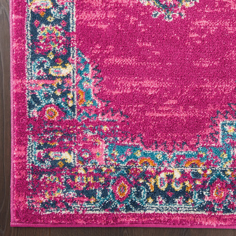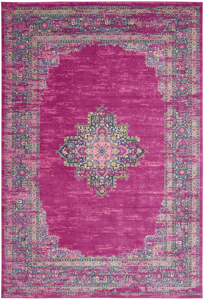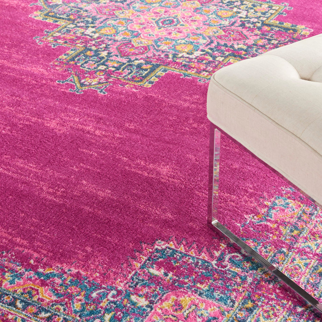 Details: Rich, lush, seductive color draws you in to the plush beauty of the lovely Passion Collection. If you thrill to the pleasures of beautifying your home, you'll find Passion area rugs simply irresistible. These fantastic florals, stunning abstracts and dramatic geometric designs meld elements of classic Persian motifs with a modern sensibility. Woven of polypropylene fibers on state-of-the-art powerlooms, this collection of area rugs combines thick, comfortable pile with an easy-care approach. Advanced overdye techniques create an exciting patina effect. Live a more colorful life with Passion in your home! This beautifully distressed Persian medallion rug merges traditional bordered rug style with a contemporary vibrance. The pink-on-pink design is adorned with traditional Persian designs in blue, orange, and green, creating a bold statement piece that will stand out in any space. The distressed effect creates a vintage vibe that's perfectly at home in a Bohemian room decor. The soft, cut pile shimmers with a beautiful glossy sheen, and combines comfort with modern easy cleaning.