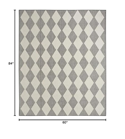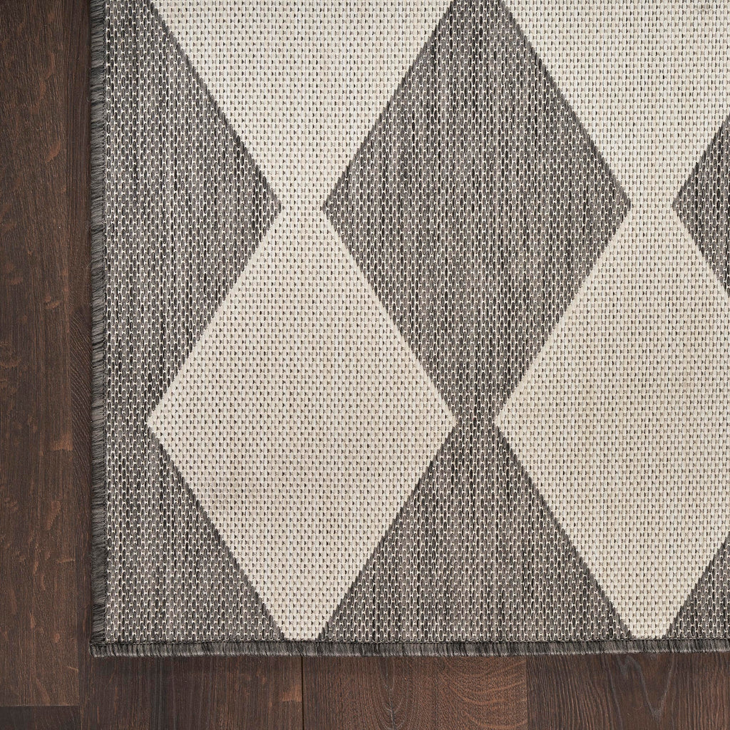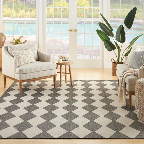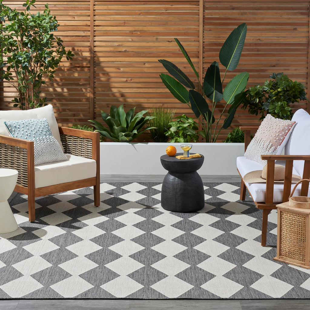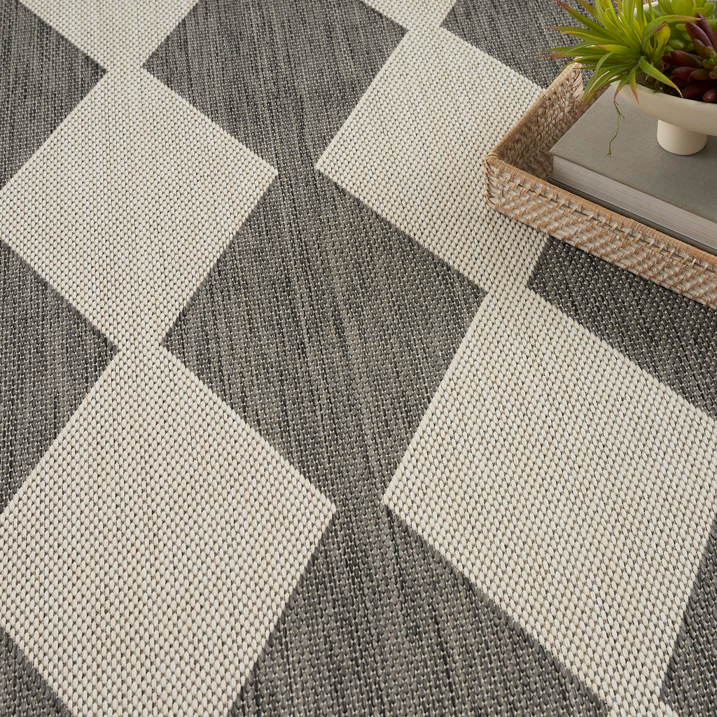 Details: Upgrade your outdoor lifestyle with the rich, textural appeal of a Positano outdoor rug. These flatweave rugs are elegant enough for your living room or dining room, yet durable enough to enjoy outdoors on your porch, patio, or deck! Choose from a spectrum of versatile neutrals and colorful rugs that display exciting variations thanks to the space-dyed, striated yarns. Machine-made from polypropylene for easy cleaning: just hose rinse and air dry. Make a statement both inside and outside your home with this checkered diamond outdoor rug from the Positano collection. The retro tile-inspired design adds a stunning pop of pattern, boosted by a space-dyed color effect in charcoal grey. This versatile rug is flat woven for easy placement in all your most used rooms – from the living room, kitchen, and bathroom to the patio, backyard, or deck.