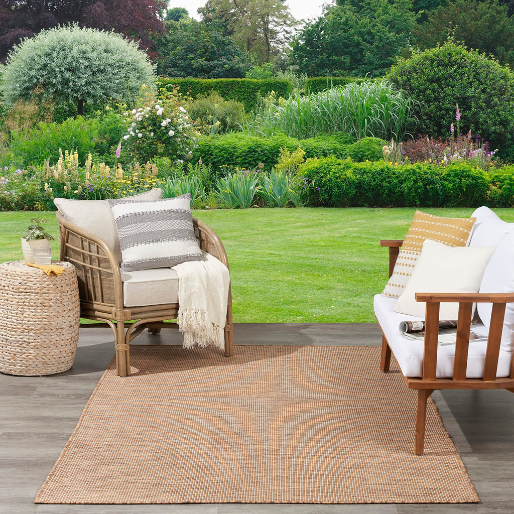 Details: Upgrade your outdoor lifestyle with the rich, textural appeal of a Positano outdoor rug. These flatweave rugs are elegant enough for your living room or dining room, yet durable enough to enjoy outdoors on your porch, patio, or deck! Choose from a spectrum of versatile neutrals and colorful rugs that display exciting variations thanks to the space-dyed, striated yarns. Machine-made from polypropylene for easy cleaning: just hose rinse and air dry. The appealing texture of this flatweave Positano outdoor rug is made beautifully visible by the space-dyed color variations of its striated yarns. This flatweave rug is machine-made from durable polypropylene fibers for easy cleaning: simply hose rinse and air dry. Presented in tan and brown tones that reflect the earthy look of jute, this versatile design easily fits in a variety of spaces – from your outdoor patio conversation area to your living room, dining room, or kitchen.