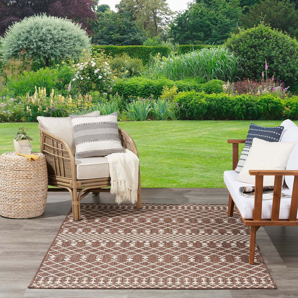 Details: Upgrade your outdoor lifestyle with the rich, textural appeal of a Positano outdoor rug. These flatweave rugs are elegant enough for your living room or dining room, yet durable enough to enjoy outdoors on your porch, patio, or deck! Choose from a spectrum of versatile neutrals and colorful rugs that display exciting variations thanks to the space-dyed, striated yarns. Machine-made from polypropylene for easy cleaning: just hose rinse and air dry. Bring boho style to with a touch of modern flair to your space with this natural brown outdoor rug from the Positano Collection. The classic Moroccan trellis pattern is woven onto a multi-toned blue ground that offers intriguing visual contrast that you can roll out just about anywhere – from the patio, deck, and balcony to the living room, dining room, and kitchen. This flatweave rug is machine-made from durable polypropylene fibers that are easy to clean: just hose rinse and air dry.