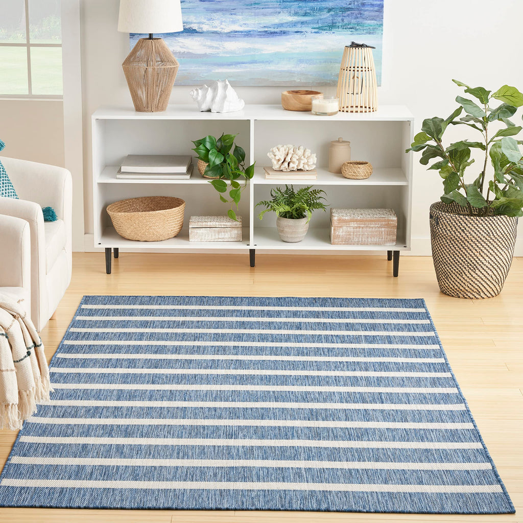 Details: Upgrade your outdoor lifestyle with the rich, textural appeal of a Positano outdoor rug. These flatweave rugs are elegant enough for your living room or dining room, yet durable enough to enjoy outdoors on your porch, patio, or deck! Choose from a spectrum of versatile neutrals and colorful rugs that display exciting variations thanks to the space-dyed, striated yarns. Machine-made from polypropylene for easy cleaning: just hose rinse and air dry. Invite coastal-inspired charm to your home with this navy blue striped outdoor rug from the Positano Collection. The space-dyed yarns add nuanced variations in color, while the flat weave construction makes placement a breeze. Roll this modern rug onto your patio, deck, or porch to create a cozy and casual conversation area, or add to your living room, dining room, or kitchen for low-maintenance yet eye-catching style. Machine-made from polypropylene yarns that are durable and easy to clean: simply hose rinse and air dry.
