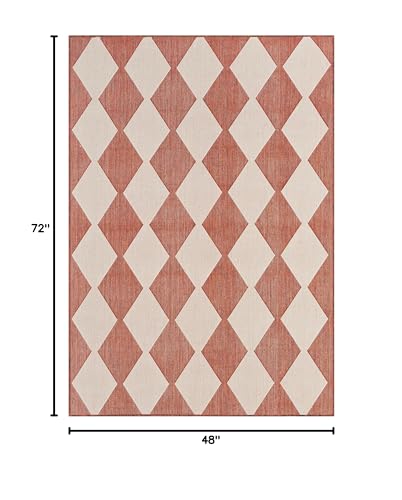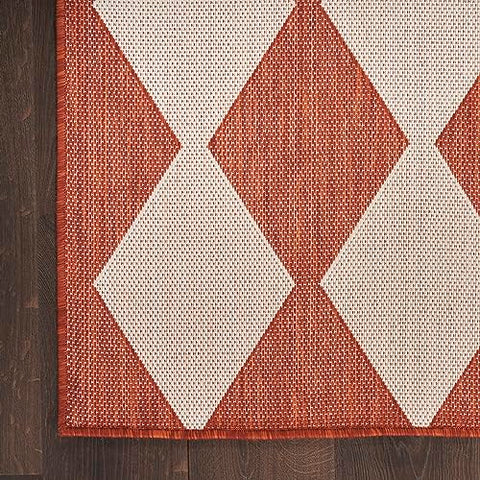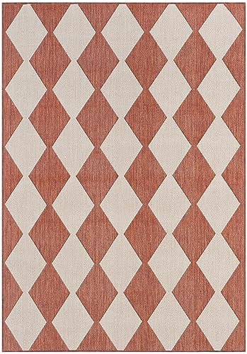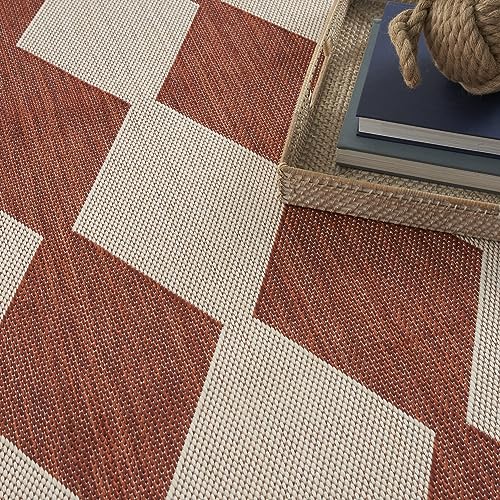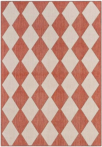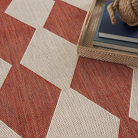 Details: Upgrade your outdoor lifestyle with the rich, textural appeal of a Positano outdoor rug. These flatweave rugs are elegant enough for your living room or dining room, yet durable enough to enjoy outdoors on your porch, patio, or deck! Choose from a spectrum of versatile neutrals and colorful rugs that display exciting variations thanks to the space-dyed, striated yarns. Machine-made from polypropylene for easy cleaning: just hose rinse and air dry. Make a statement both inside and outside your home with this checkered diamond outdoor rug from the Positano collection. The retro tile-inspired design adds a stunning pop of pattern, boosted by a space-dyed color effect in terracotta orange. This versatile rug is flat woven for easy placement in all your most used rooms – from the living room, kitchen, and bathroom to the patio, backyard, or deck.