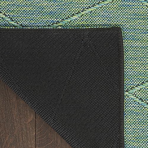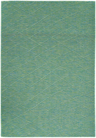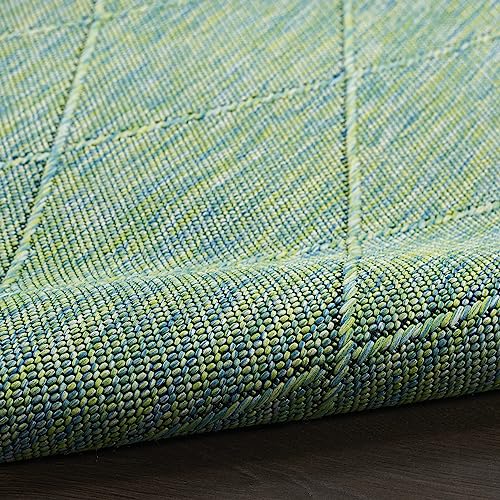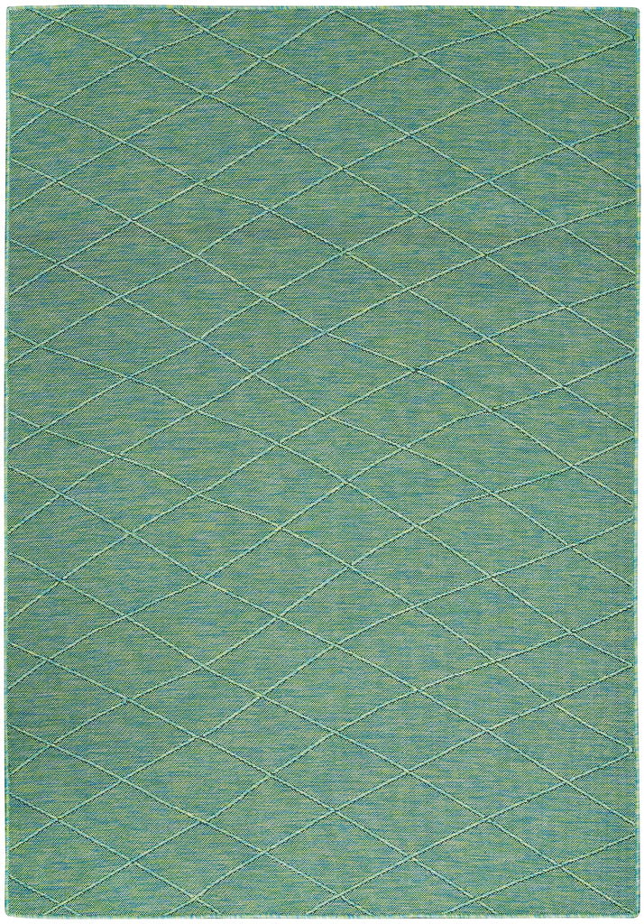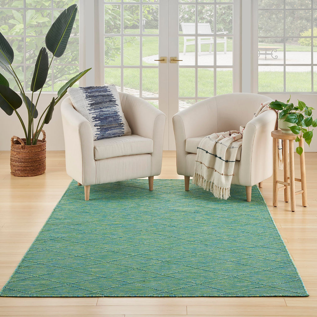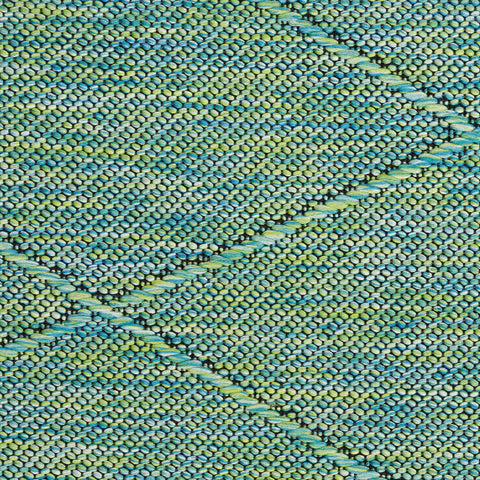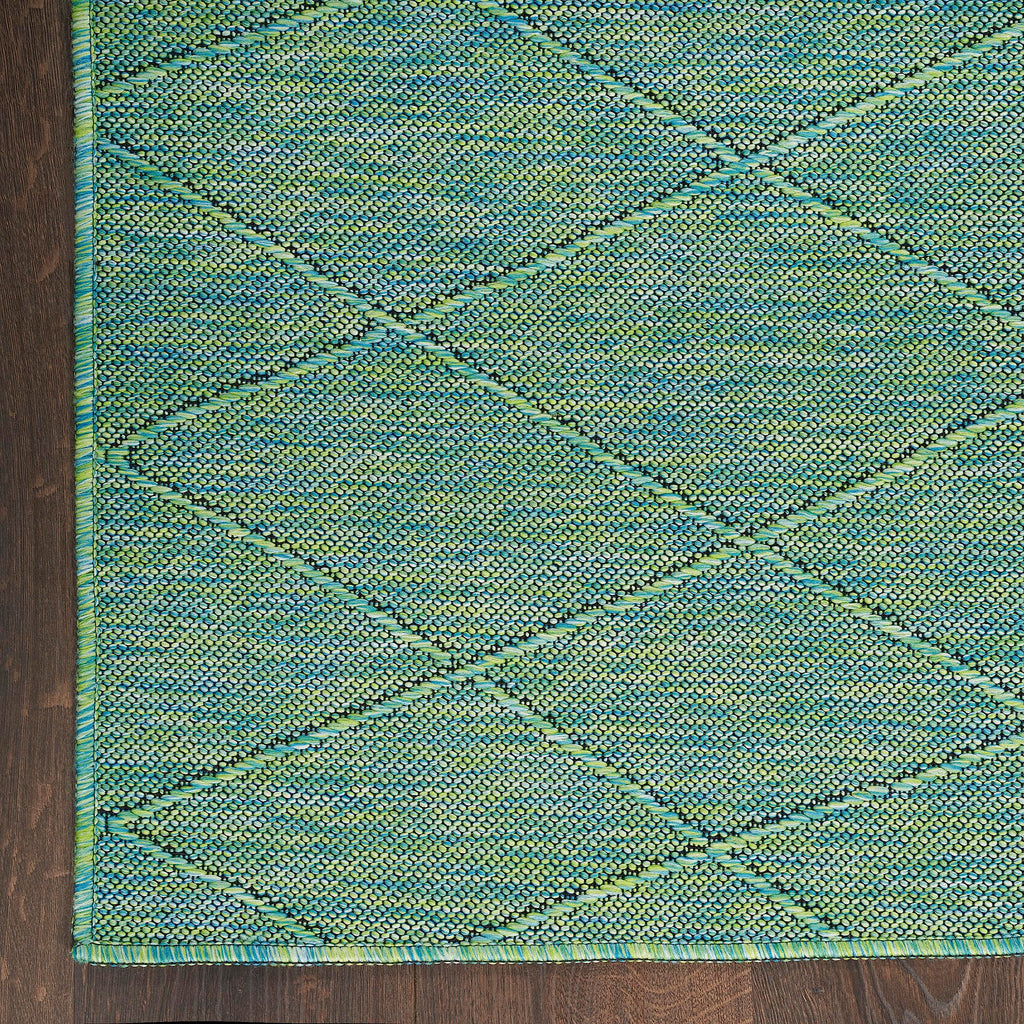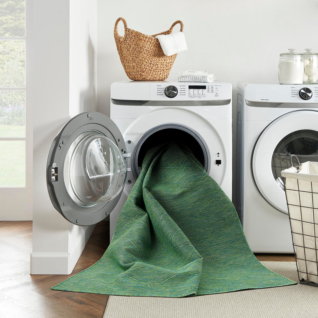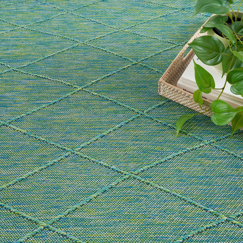 Details: Chic style meets easy living with the Practical Solutions Collection of outdoor rugs. Family friendly by design, these versatile washable rugs instantly add style and function to any space – from high-traffic rooms inside the home to alfresco spaces. Machine-made from polypropylene, these geometric rugs give you the best of everything: dimensional texture, easy cleaning, a non-slip backing, and foldability for easy storage. To clean, simply toss into a washing machine and air dry. Commercial washer required for rugs 8 x 10 and larger. This blue-green washable outdoor rug from the Practical Solutions Collection brings visual appeal with a touch of texture to your space. The geometric lattice pattern, woven onto a flat ground, is made from polypropylene yarns that are softly textured and easy to clean. Finished with a non-slip backing for added safety on hard floors – perfect inside in high-traffic areas inside the home as well as outside. Place rugs sized 8 x 10 or larger in a commercial washing machine.