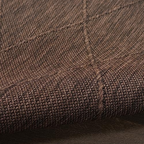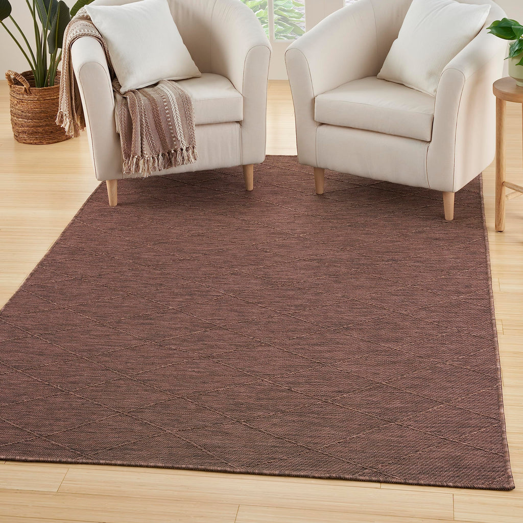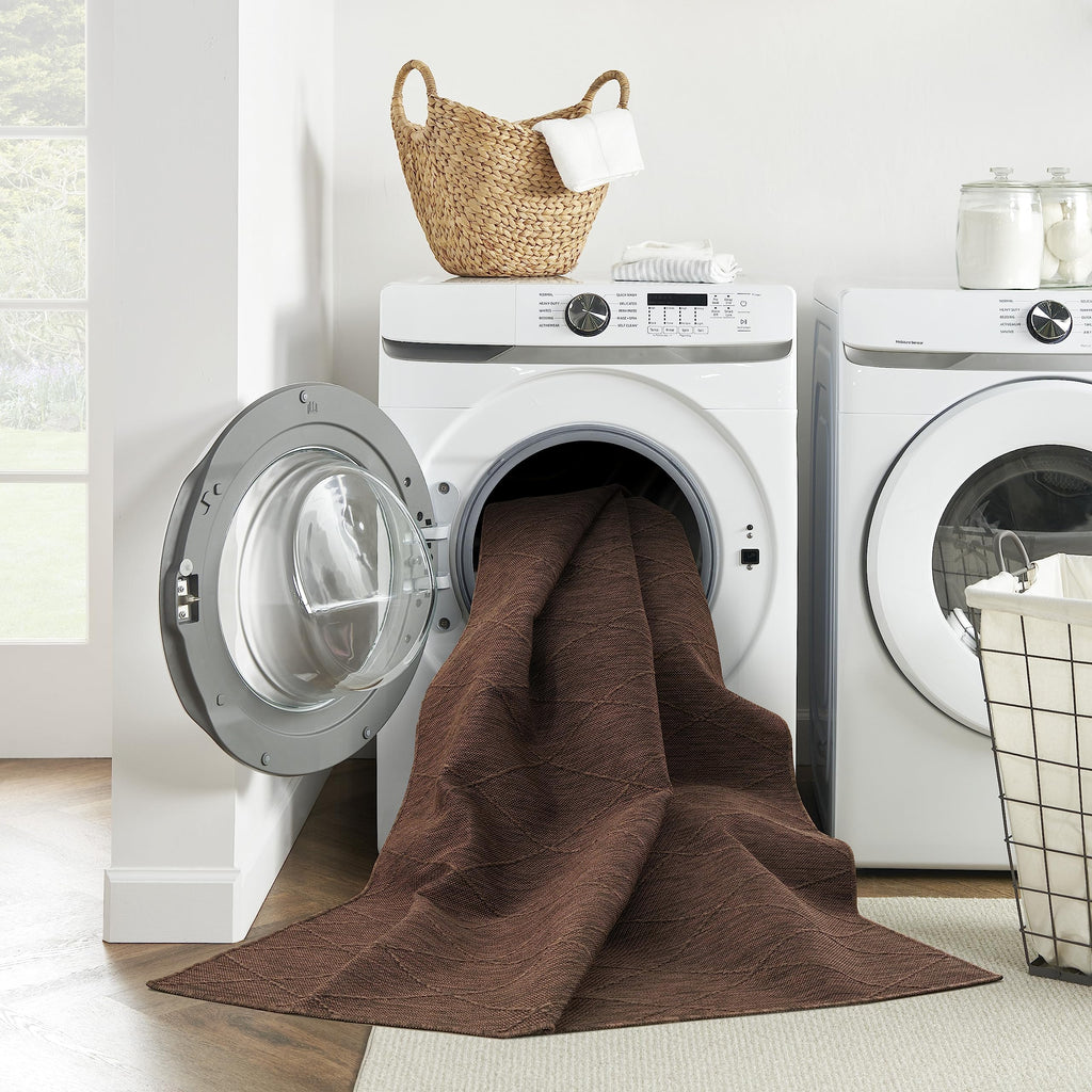 Details: Chic style meets easy living with the Practical Solutions Collection of outdoor rugs. Family friendly by design, these versatile washable rugs instantly add style and function to any space – from high-traffic rooms inside the home to alfresco spaces. Machine-made from polypropylene, these geometric rugs give you the best of everything: dimensional texture, easy cleaning, a non-slip backing, and foldability for easy storage. To clean, simply toss into a washing machine and air dry. Commercial washer required for rugs 8 x 10 and larger. This mocha brown washable outdoor rug from the Practical Solutions Collection brings visual appeal with a touch of texture to your space. The geometric lattice pattern, woven onto a flat ground, is made from polypropylene yarns that are softly textured and easy to clean. Finished with a non-slip backing for added safety on hard floors – perfect inside in high-traffic areas inside the home as well as outside. Place rugs sized 8 x 10 or larger in a commercial washing machine.