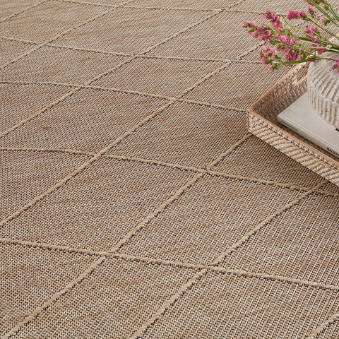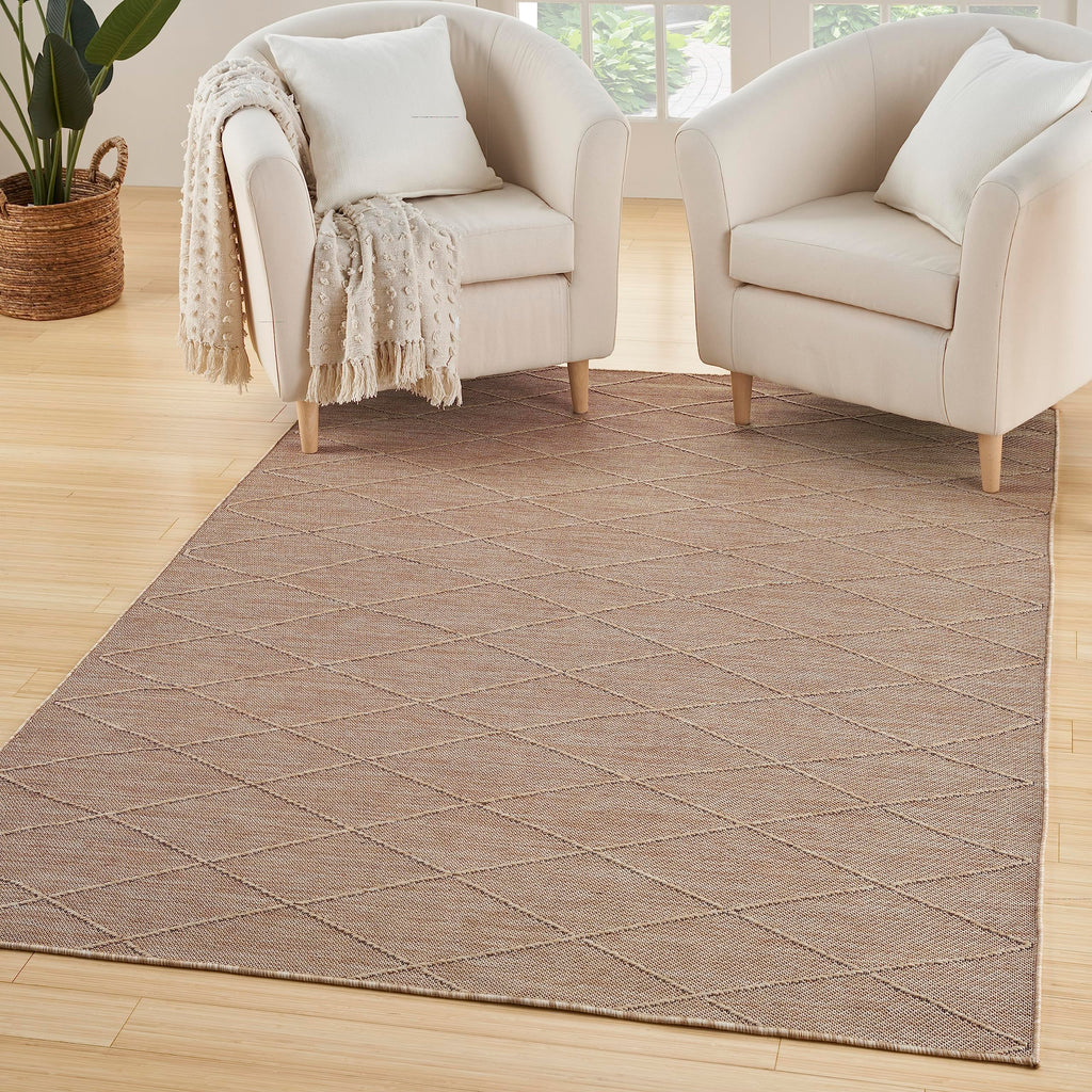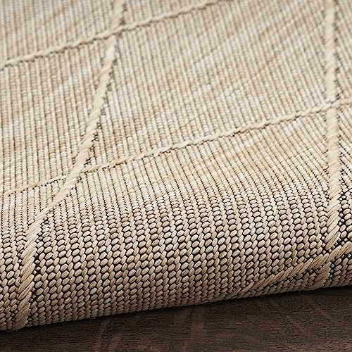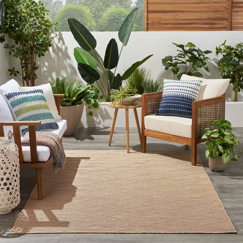 Details: Chic style meets easy living with the Practical Solutions Collection of outdoor rugs. Family friendly by design, these versatile washable rugs instantly add style and function to any space – from high-traffic rooms inside the home to alfresco spaces. Machine-made from polypropylene, these geometric rugs give you the best of everything: dimensional texture, easy cleaning, a non-slip backing, and foldability for easy storage. To clean, simply toss into a washing machine and air dry. Commercial washer required for rugs 8 x 10 and larger. This tan washable outdoor rug from the Practical Solutions Collection brings visual appeal with a touch of texture to your space. The geometric lattice pattern, woven onto a flat ground, is made from polypropylene yarns that are softly textured and easy to clean. Finished with a non-slip backing for added safety on hard floors – perfect inside in high-traffic areas inside the home as well as outside. Place rugs sized 8 x 10 or larger in a commercial washing machine.