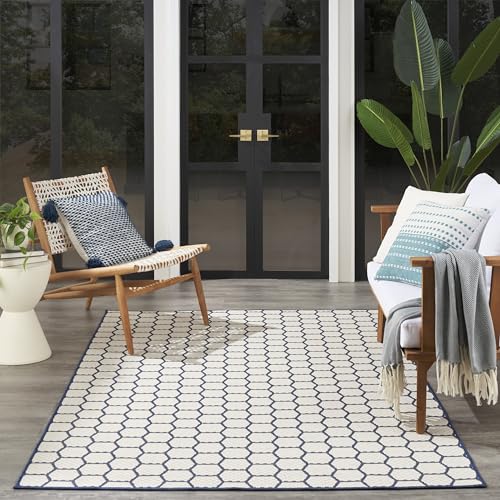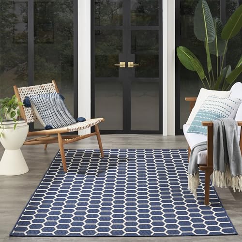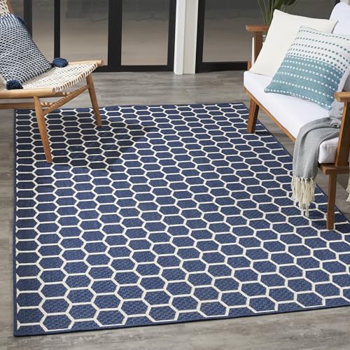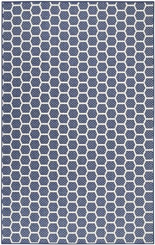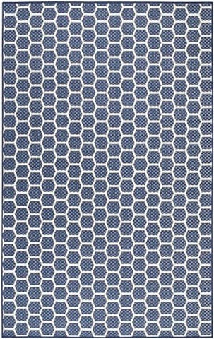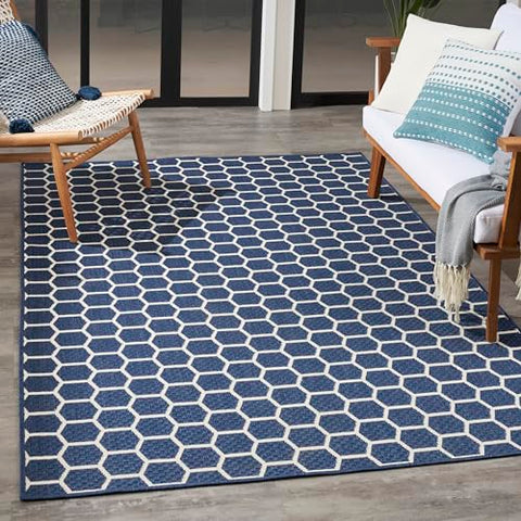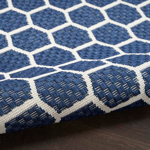 Details: Show off your love of bold and modern style with the Reversible Indoor/Outdoor Collection. These rugs epitomize versatility: whenever you want to switch up your style, just flip one over! Each design reverses to an inverted variation of the same pattern, giving you two distinctive ways to style one rug. Reversible Indoor/Outdoor rugs are made for everyday living with a lightweight, flatweave construction that you can easily vacuum and hose rinse to keep clean. Choose from a variety of sizes including runners for the kitchen, 9x12 rugs for the living room or a large deck, and 5x7 rugs for bedrooms and small apartments. Refresh your outdoor décor with the bold style of this navy-blue geometric rug from the Reversible Indoor/Outdoor Collection. The honeycomb design adds an instant pop of pattern that you can dial up or tone down by flipping it over to an inverted color variant of the same pattern. This reversible rug is an ultra-versatile pick that not only gives you two looks in one but fits seamlessly in both indoor and outdoor spaces. Made from polypropylene and polyester fibers that are low maintenance and easy to clean.