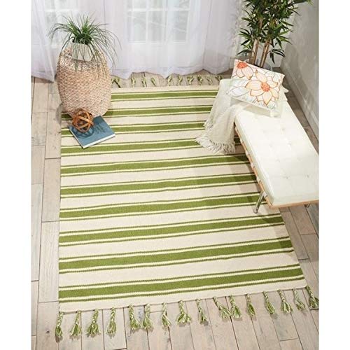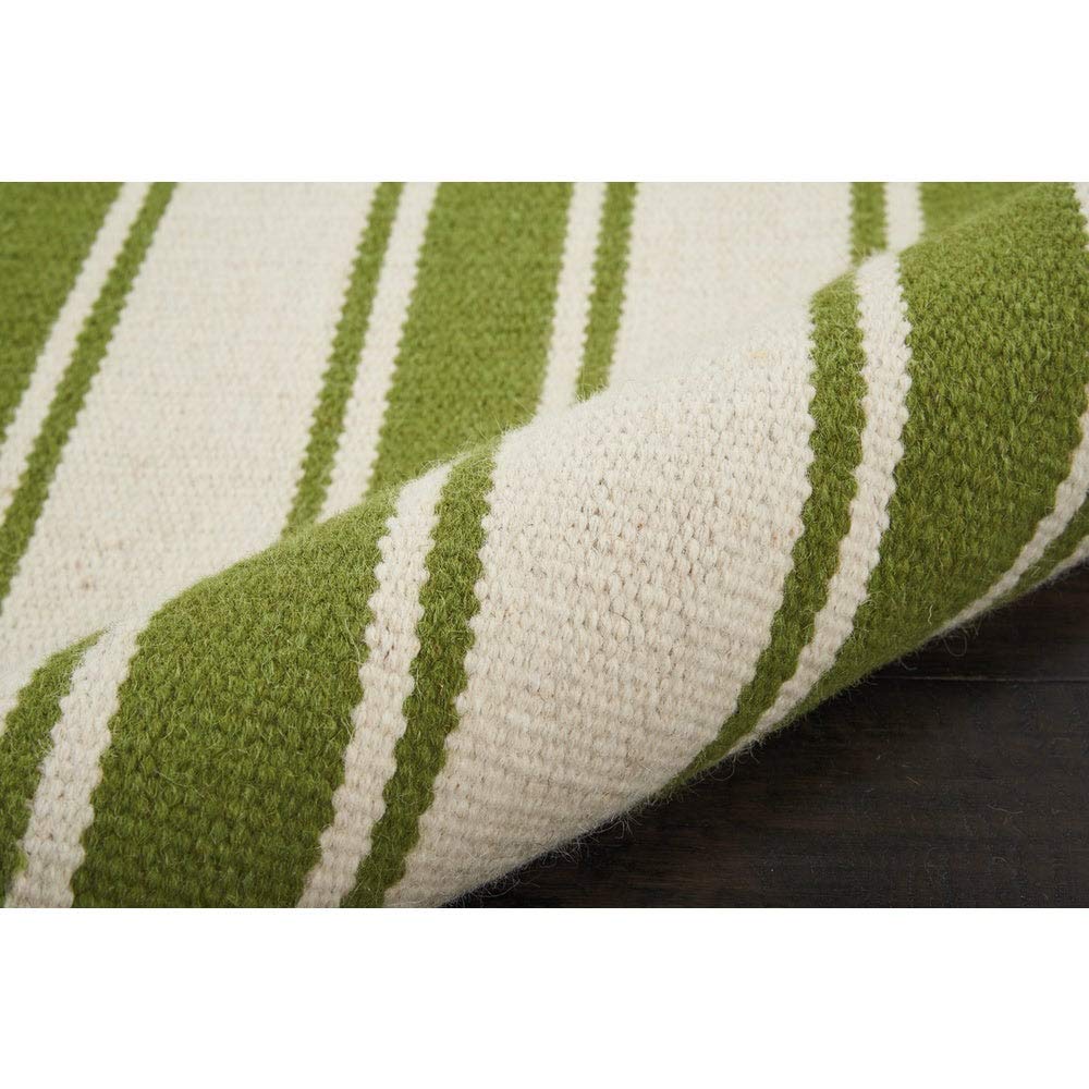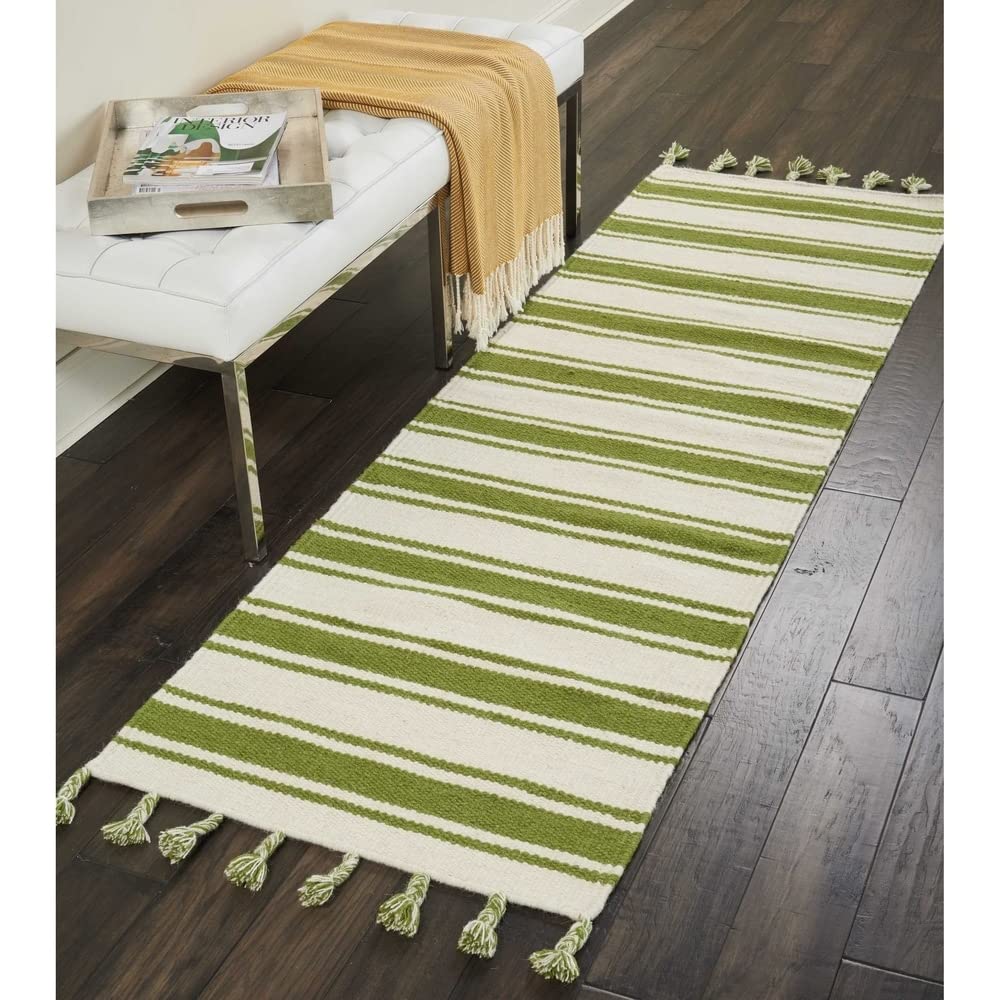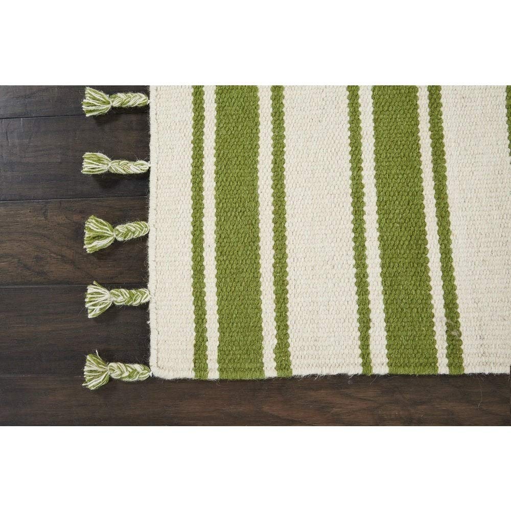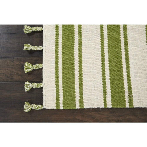 Details: With its statement-making stripes, fabulous fringes and exuberant shades of ivory and green, this reversible Solano Durries area rug from Morison will lend a carefree splash of color and a fun, fresh focal point to any room. Hand and flat woven for a superb texture and enduring excellence.