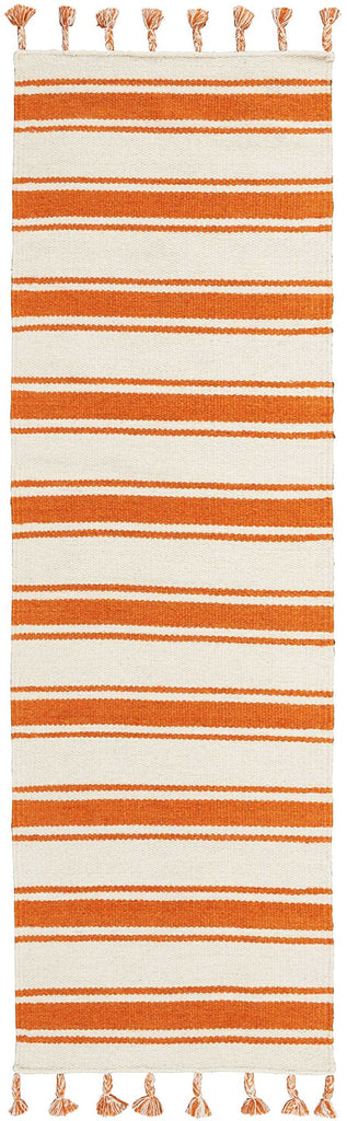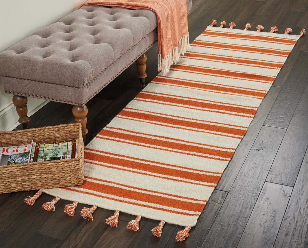 Details: With its statement-making stripes, fabulous fringes and upbeat shades of ivory and orange, this reversible Solano Durries area rug from Morison will lend a carefree splash of color and a fun, fresh focal point to any room. Hand and flat woven for a superb texture and enduring excellence.